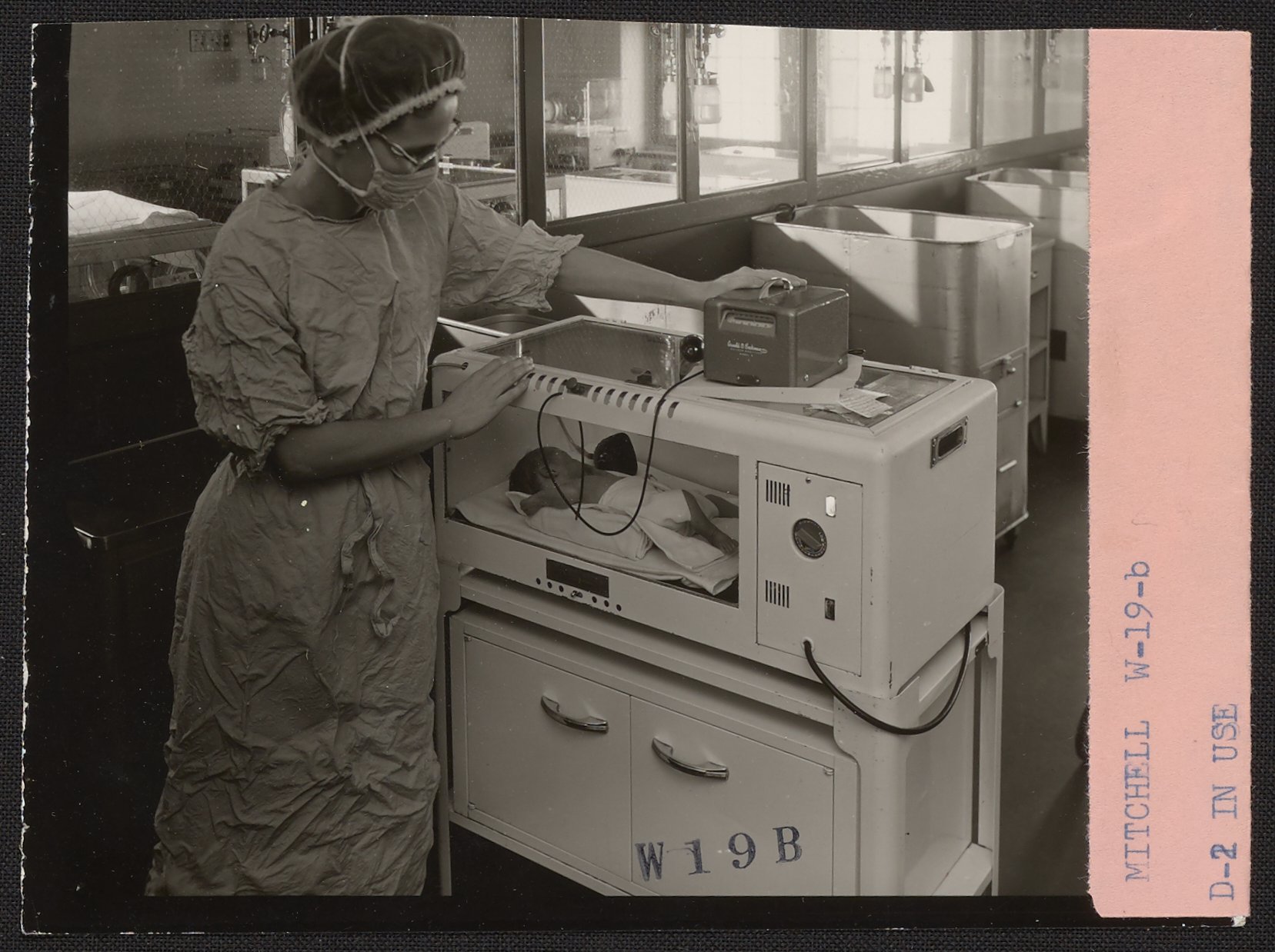 Preston E. Mitchell Commercial Photography. “Beckman D-2 Oxygen Meter in Use in a Hospital Nursery,” circa 1960. Beckman Historical Collection, Box 86. Science History Institute. Philadelphia. https://digital.sciencehistory.org/works/mp48sc84s.