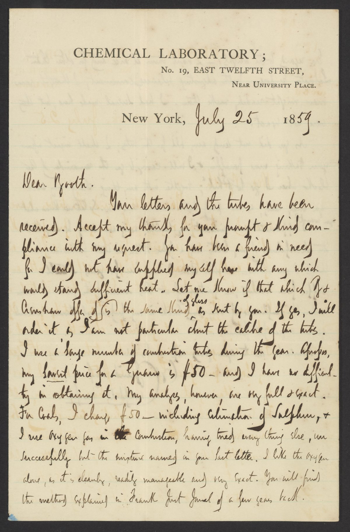 Morfit, Campbell. “Letter from Campbell Morfit to James Curtis Booth, July 25, 1859,” July 25, 1859. Papers of James Curtis Booth, Box 1, Folder 10. Science History Institute. Philadelphia. https://digital.sciencehistory.org/works/mrjvoo3.