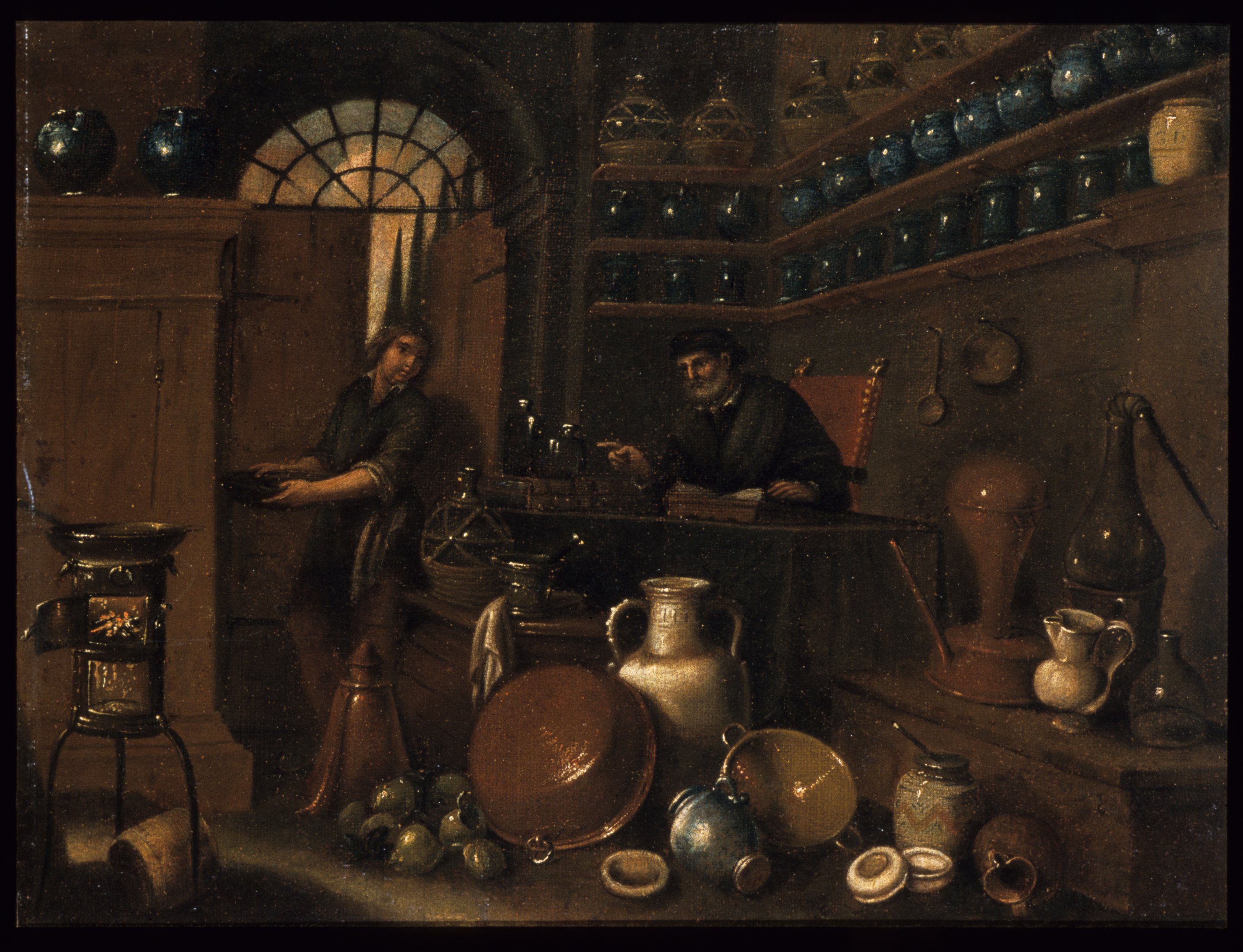 A seated alchemist instructs his young apprentice in this image of a large and well-stocked apothecary's shop. The walls are lined with blue ceramic vessels likely containing medicines, tonics and purgatives, as well as natural oils and herbs. A small portable furnace heats a pan at left. Distillation equipment--glass alembics and other vessels--are piled at right. Fruits and vegetables spill out on the floor alongside pans and basins for preparing organic medicinal goods.
