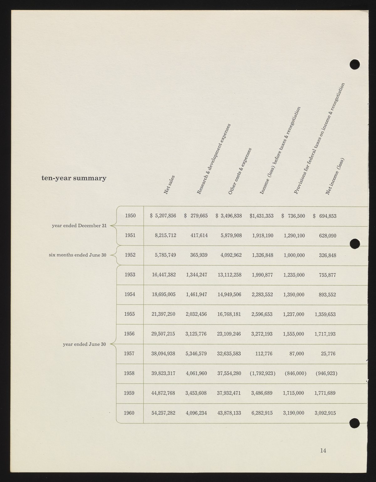 Small JPG1200 x 1522px — 175 KBFull-sized JPG2725 x 3456px — 908 KBOriginal fileTIFF — 2725 x 3456px — 27.0 MBThe 1960 annual report covers a year of notable milestones. It was the 25th anniversary of the company. The report devoted several pages to highlighting new instruments, including a number of pH meters and the DB double-beam spectrophotometer. The company expanded the medical benefits offered to employees. A Special Projects Division was formed under Max Liston; the Shockley Transistor Corporation, which had always operated at a loss, was sold. Corporate branding, advertising, and centralization of divisional operations were also discussed.