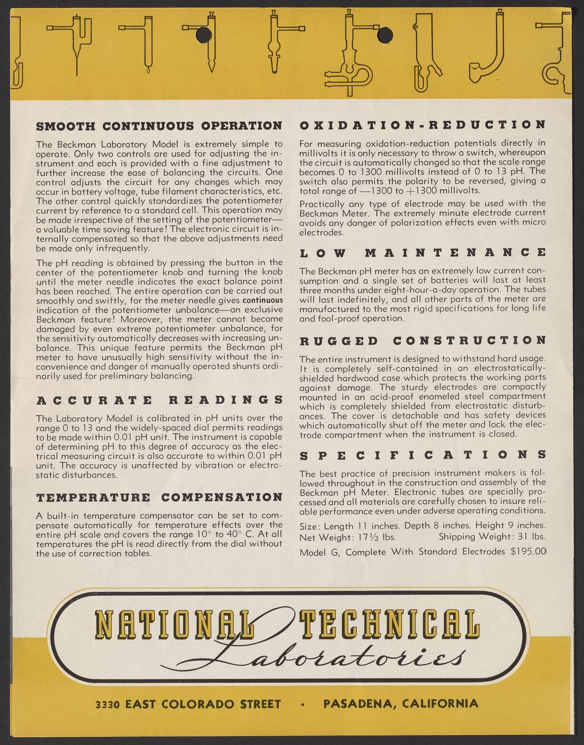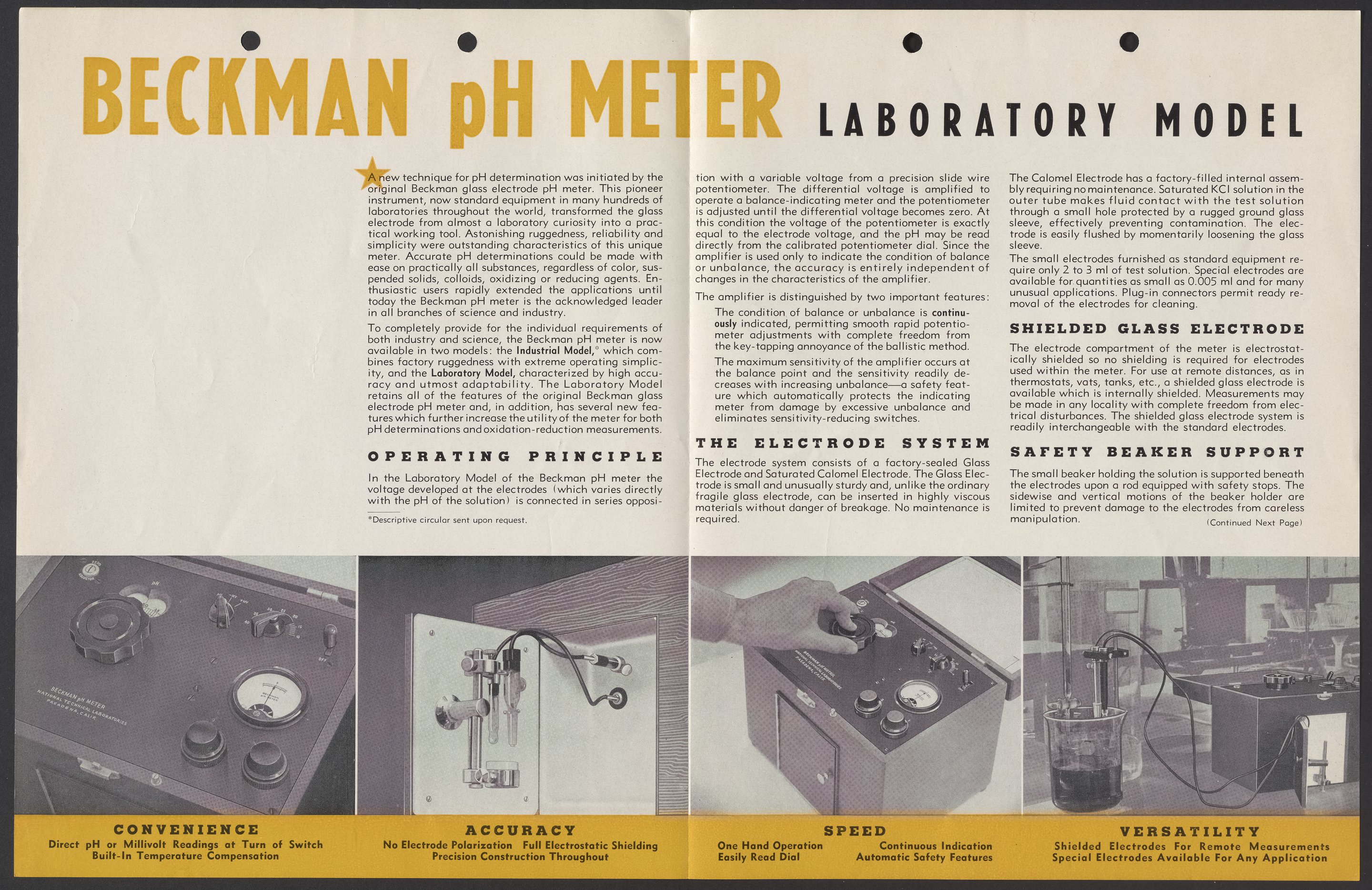 Beckman Instruments, Inc. “Beckman PH Meter (Laboratory Model) Brochure,” 1935–1940. Beckman Historical Collection, Box 20, Folder 2. Science History Institute. Philadelphia. https://digital.sciencehistory.org/works/ms35t952z.