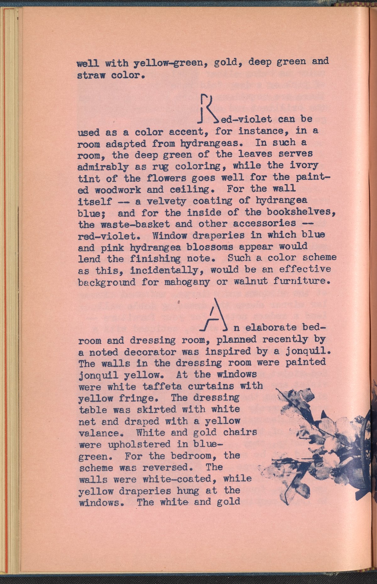 Booklet corresponding to a radio broadcast program created by the National Paint, Varnish, and Lacquer Association. The booklet describes how to take inspiration from nature to determine color scheme and decorations when designing a room. Includes small stylized illustrations, monotone photographs, and decorated covers.
