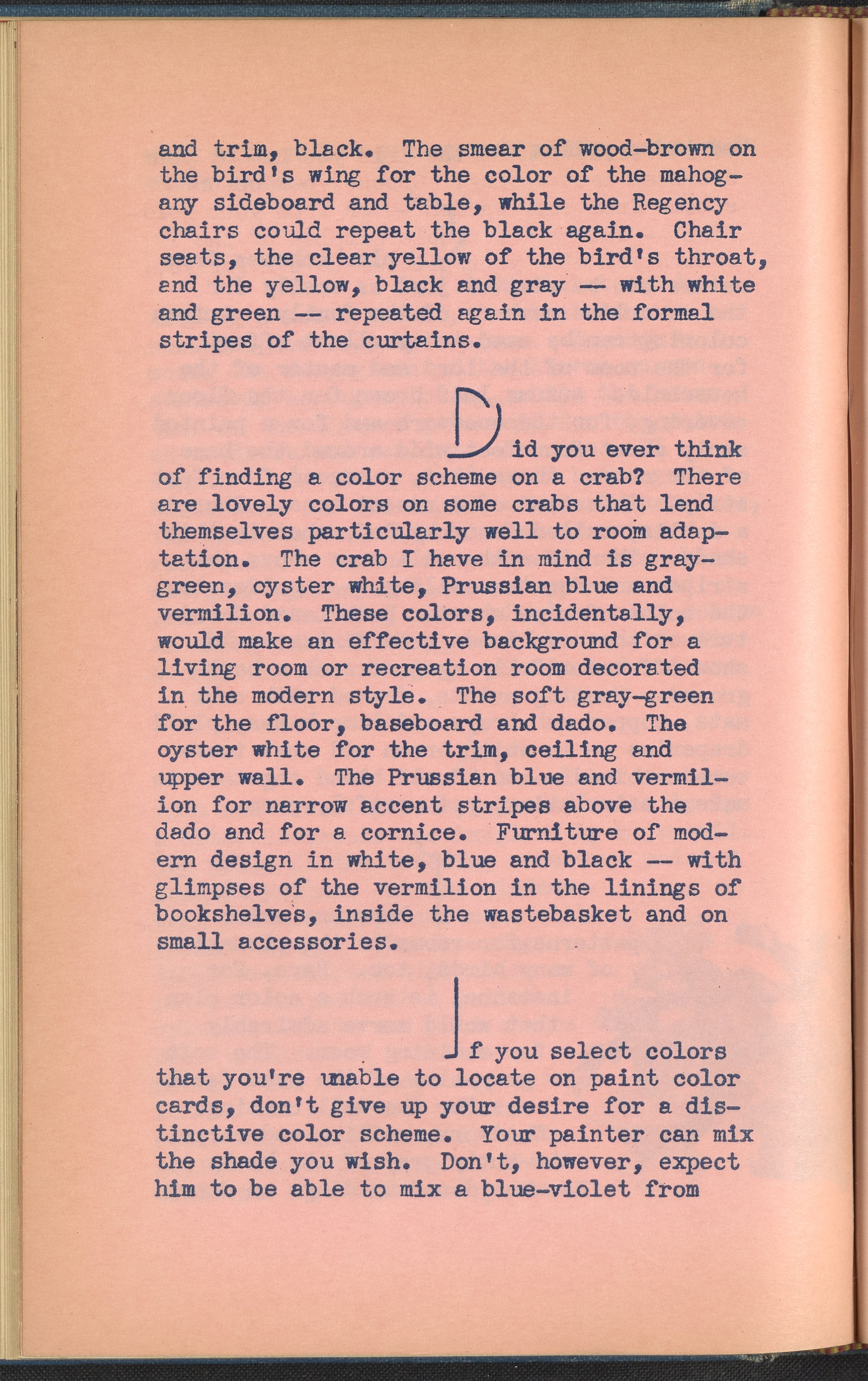 Booklet corresponding to a radio broadcast program created by the National Paint, Varnish, and Lacquer Association. The booklet describes how to take inspiration from nature to determine color scheme and decorations when designing a room. Includes small stylized illustrations, monotone photographs, and decorated covers.