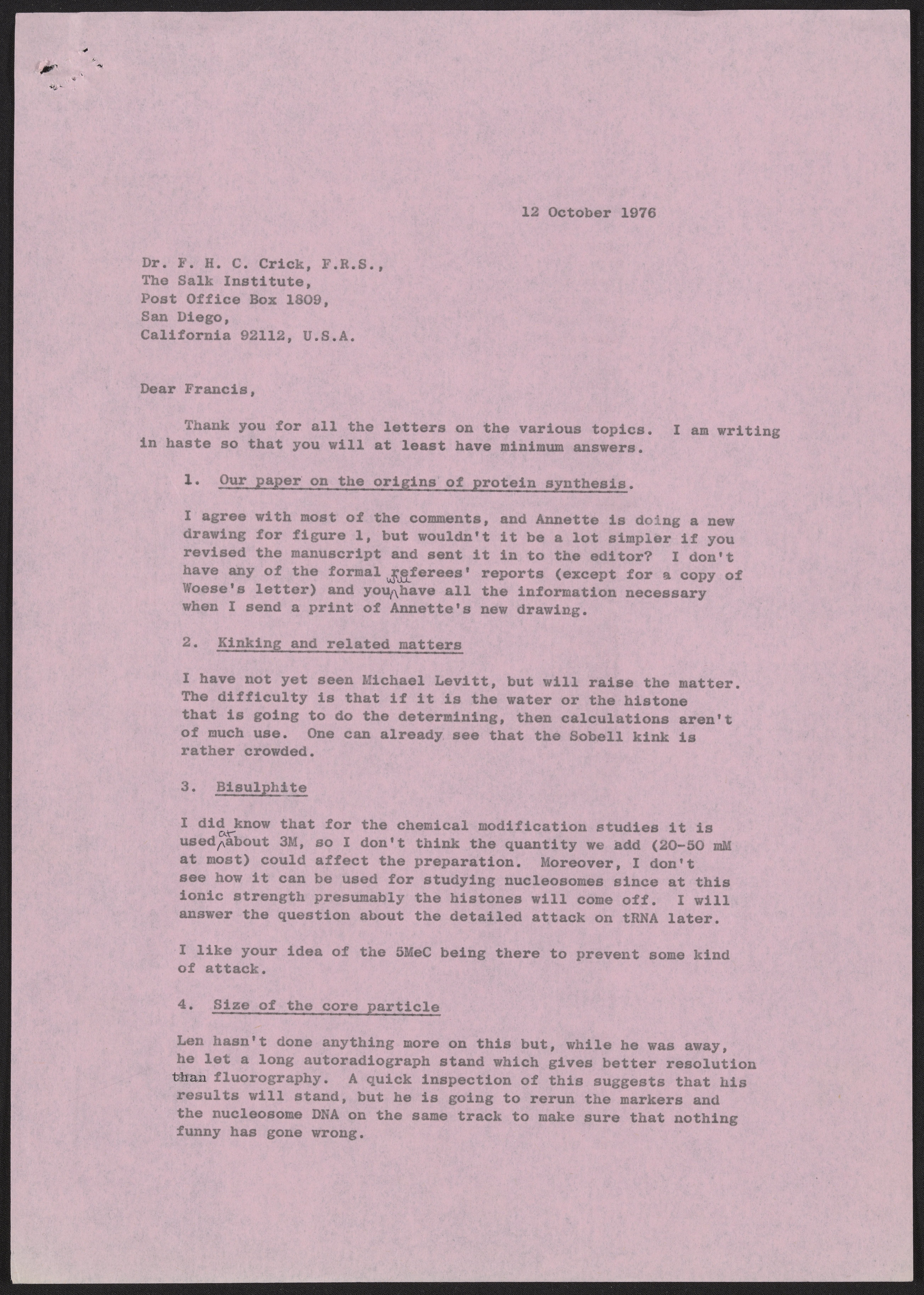 Letter from Aaron Klug to Francis Crick, October 12, 1976