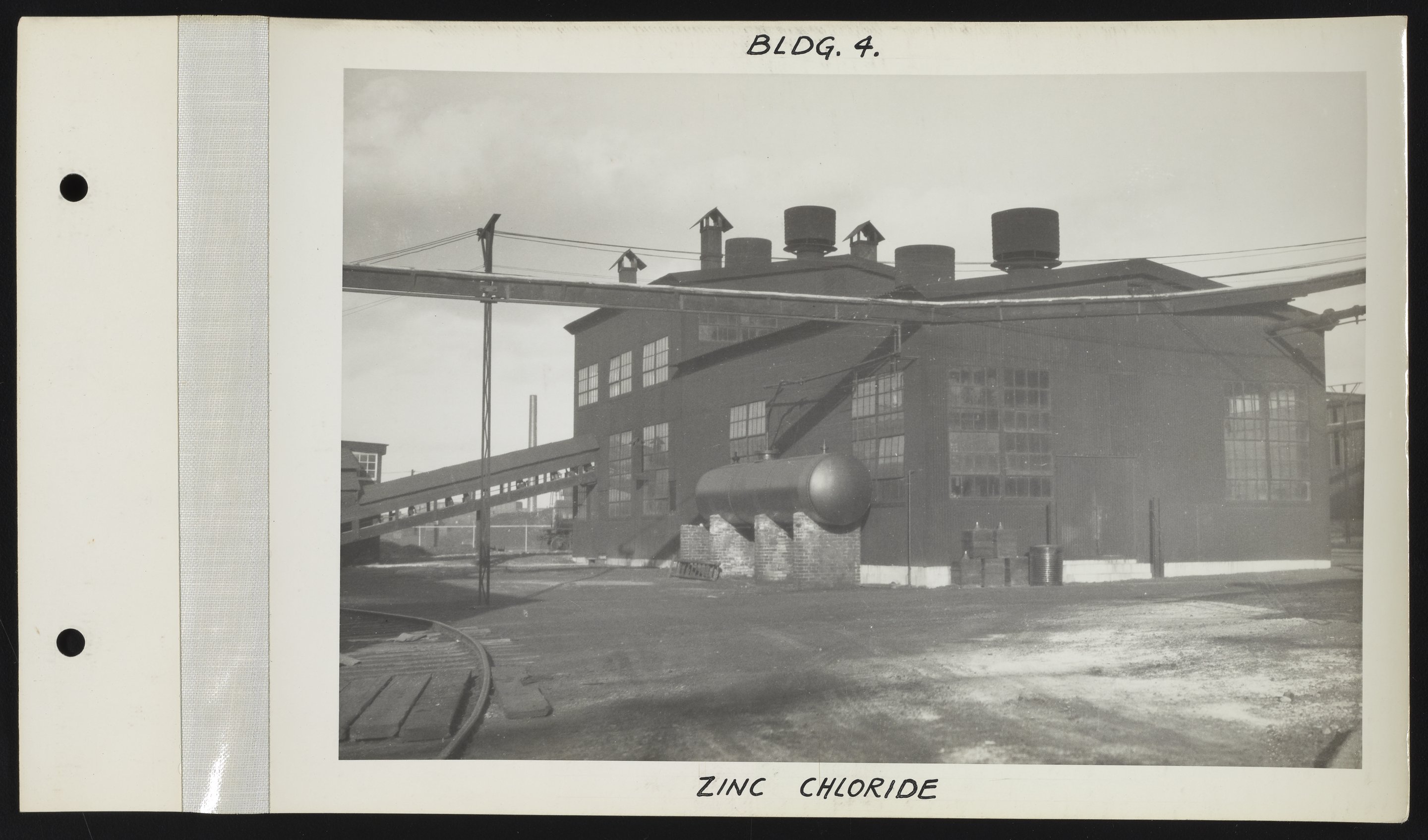 Rohm and Haas Company. “Zinc Chloride Manufacturing Plant.” Exterior Views of Charles Lennig and Company Plant in Bridesburg, 1931. Rohm & Haas Company Archives, Box 27 (Photographs), Folder 8. Science History Institute. Philadelphia. https://digital.sciencehistory.org/works/mw22v610p.