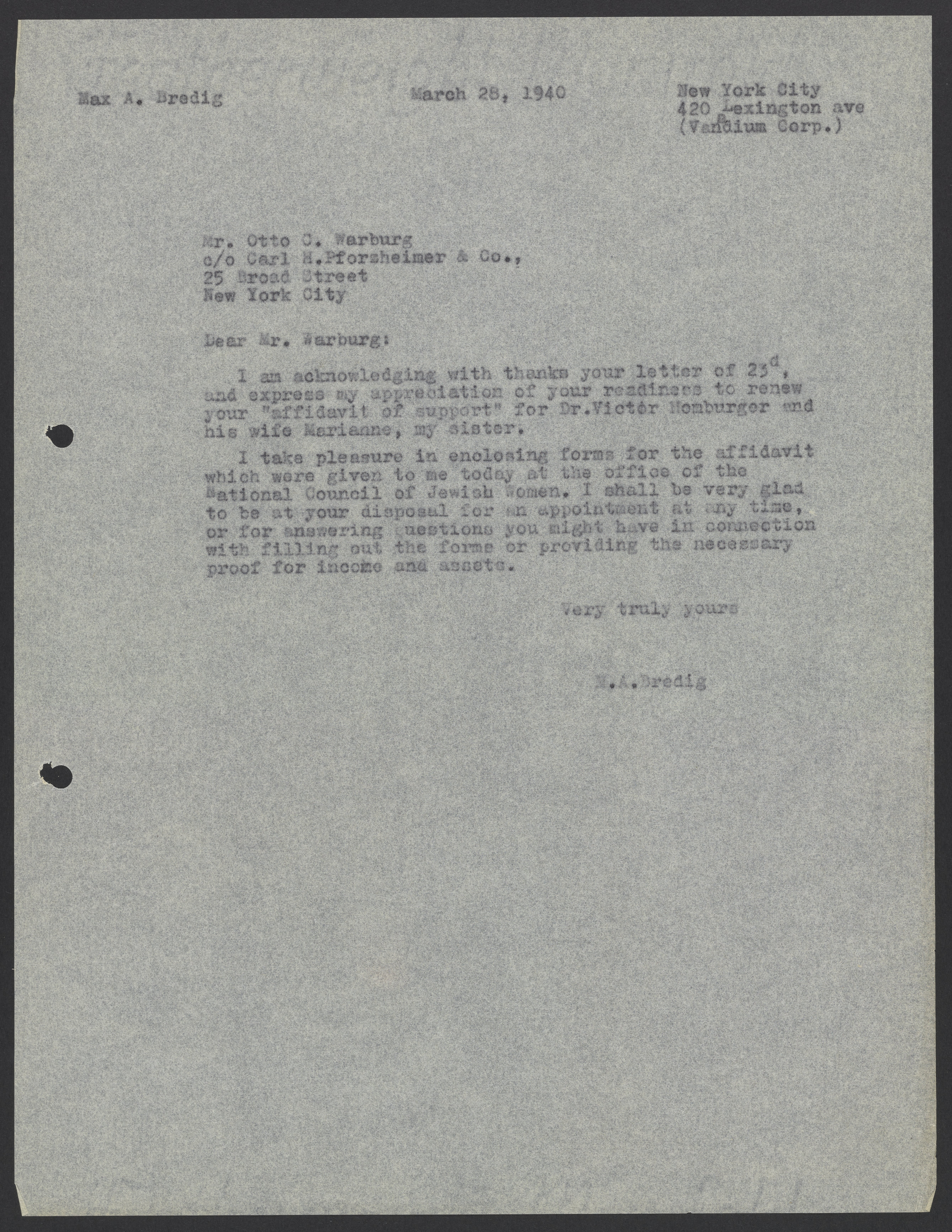 Max Bredig (1902-1977) thanks Otto Warburg for renewing his affidavit to vouch for the immigration of Viktor Homburger (1888-1968) and Marianne Homburger (1903-1986).