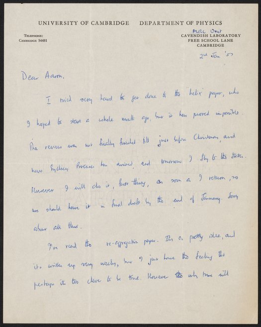Crick, Francis. “Letter from Francis Crick to Aaron Klug, January 2, 1957,” January 2, 1957. History of Molecular Biology Collection, Box 19, Folder 16. Science History Institute. Philadelphia. https://digital.sciencehistory.org/works/myccqd8.