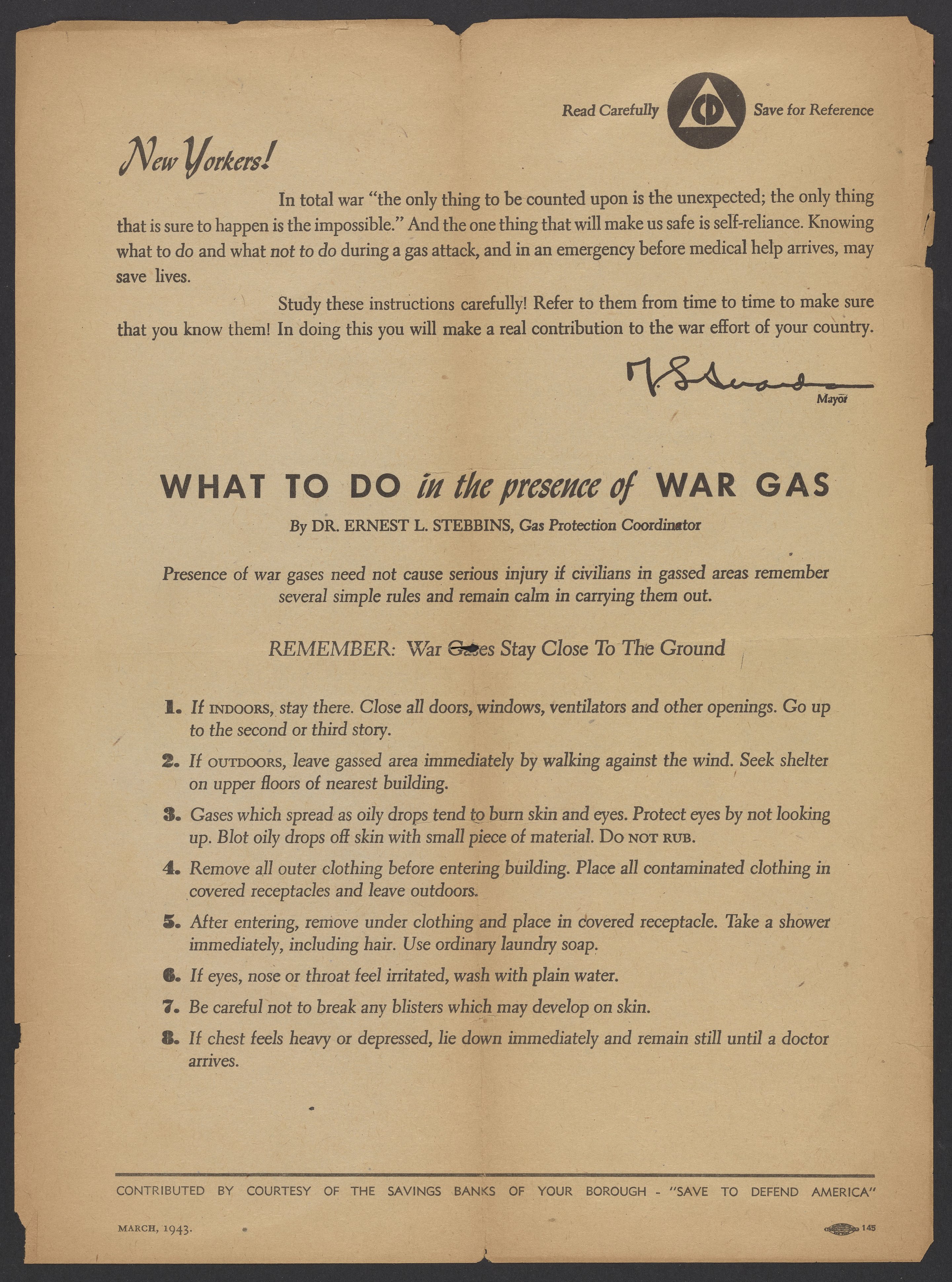 United States. Office of Civilian Defense. “What To Do in the Presence of War Gas,” March 1943. Papers of Georg and Max Bredig, Box 4, Folder 9. Science History Institute. Philadelphia. https://digital.sciencehistory.org/works/myov92v.