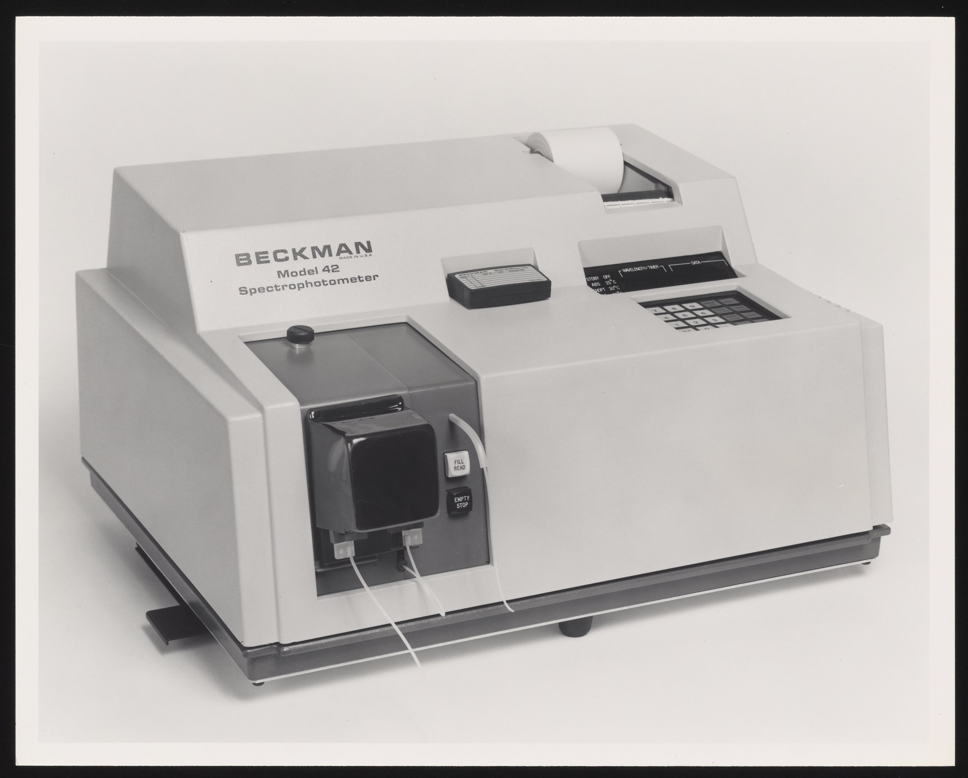 First produced in 1981, the Beckman Model 42 Clinical Spectrophotometer incorporated a UV/visible spectrophotometer, a microprocessor, and a printer into one unit.
