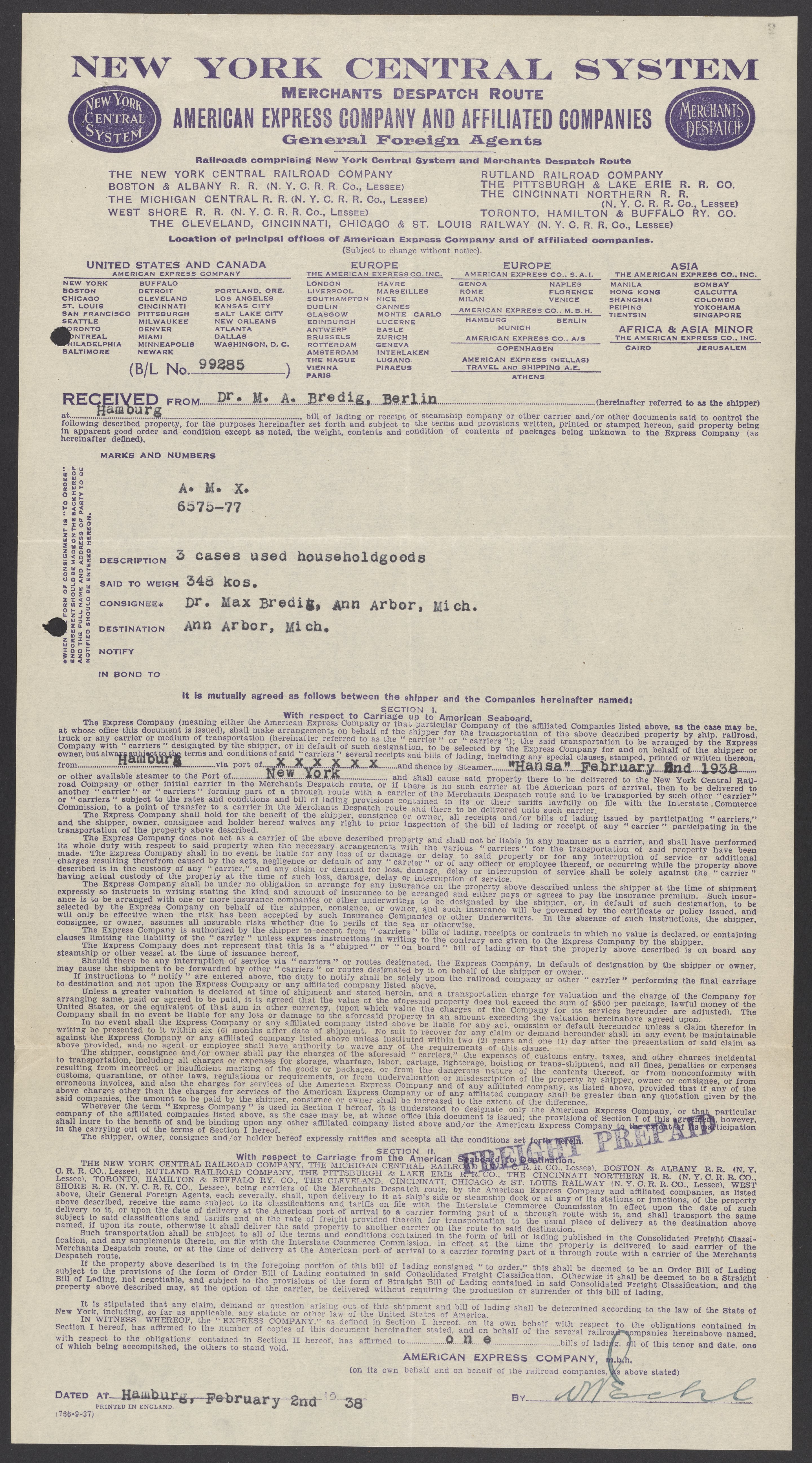 Shipping order from the New York Central System and other railroad companies