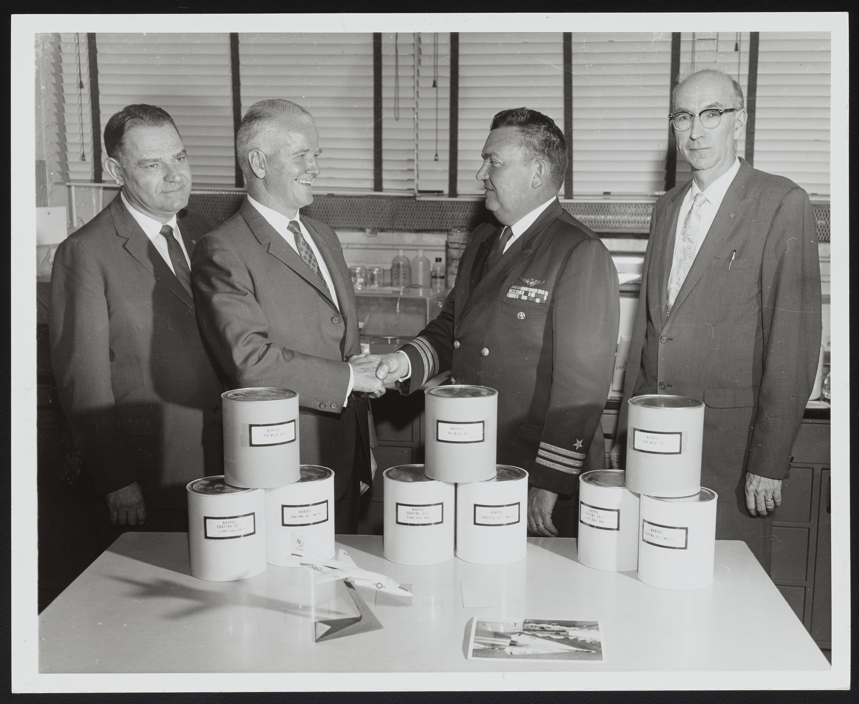 Group photograph taken to mark the development of the NARPOL aircraft coating system at the Naval Air Engineering Center's Aeronautical Materials Laboratory, Polymer Division. NARPOL is a partially fluorinated polyphenyl ester polymer used to coat aircraft metals. Several canisters of NARPOL primers and coatings, as well as a model aircraft are visible on the table. The individuals present in the photograph are identified as follows (left to right): Mr. C.A. Cassola (High Polymer Division Superintendent); Mr. W.W. Howerton (Polymer chemist); Cdr. R.L. Abbott (Laboratory Director); and Mr. J. Hartley Bowen (Technical Director).