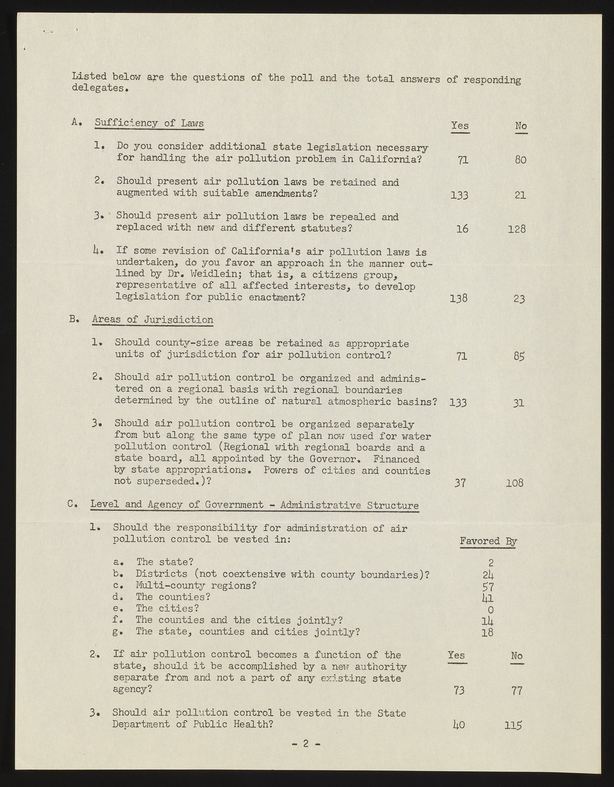 Small JPG1200 x 1541px — 282 KBFull-sized JPG2756 x 3540px — 1.3 MBOriginal fileTIFF — 2756 x 3540px — 28.0 MBThis survey was conducted at the Statewide Conference on Air Pollution Legislation, held in San Francisco on February 21, 1955. The results indicate that (among other things) attendees favored creating new air pollution legislation on a regional basis, with those regions based on natural atmospheric boundaries. Respondents also supported federal and state tax incentives for any installation of pollution-controlling equipment, state funded research into the causes of air pollution, and only proceeding with abatement procedures if an emission had been proved harmful through that research.
