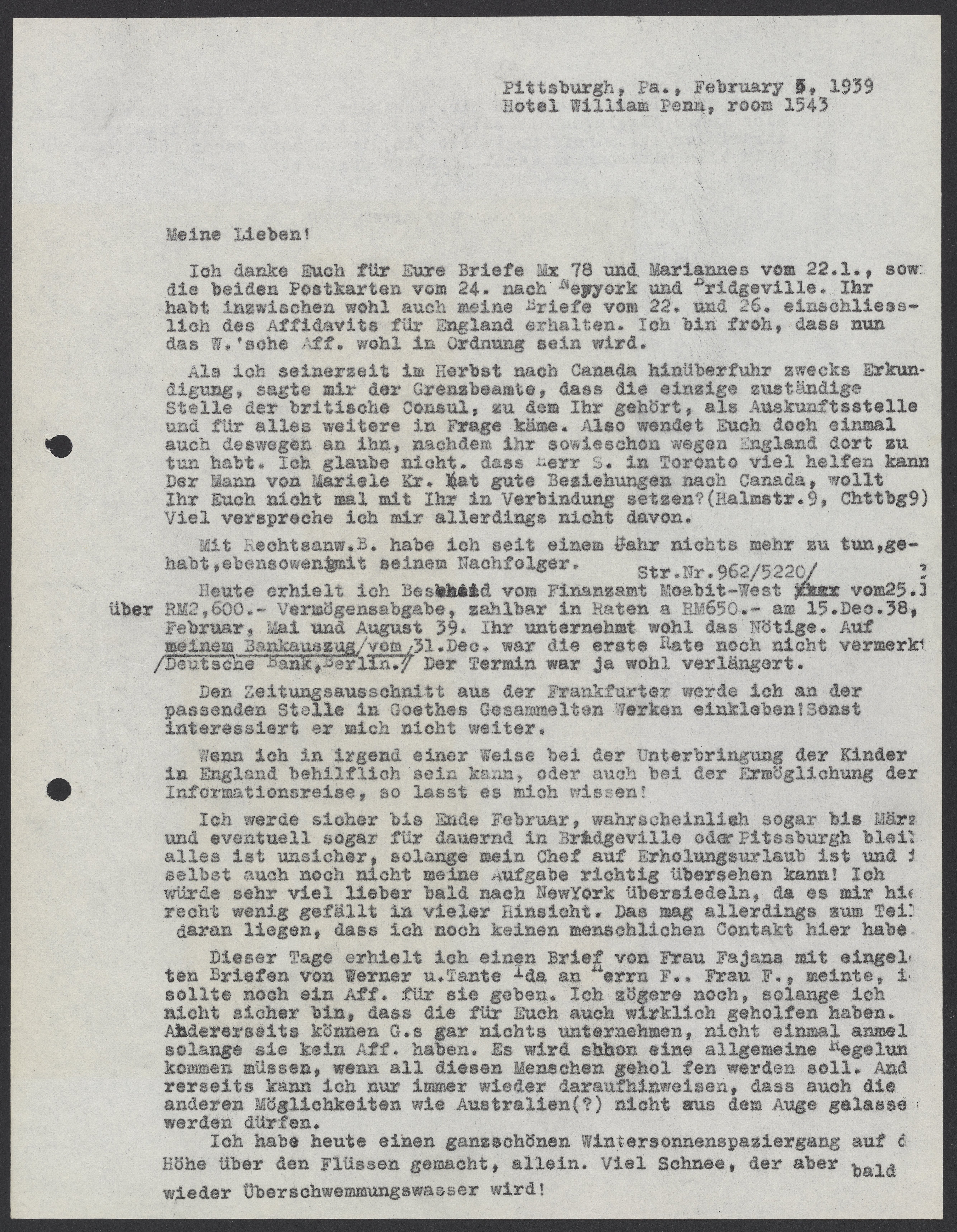 Letter from Max Bredig to Marianne and Viktor Homburger, February 5, 1939