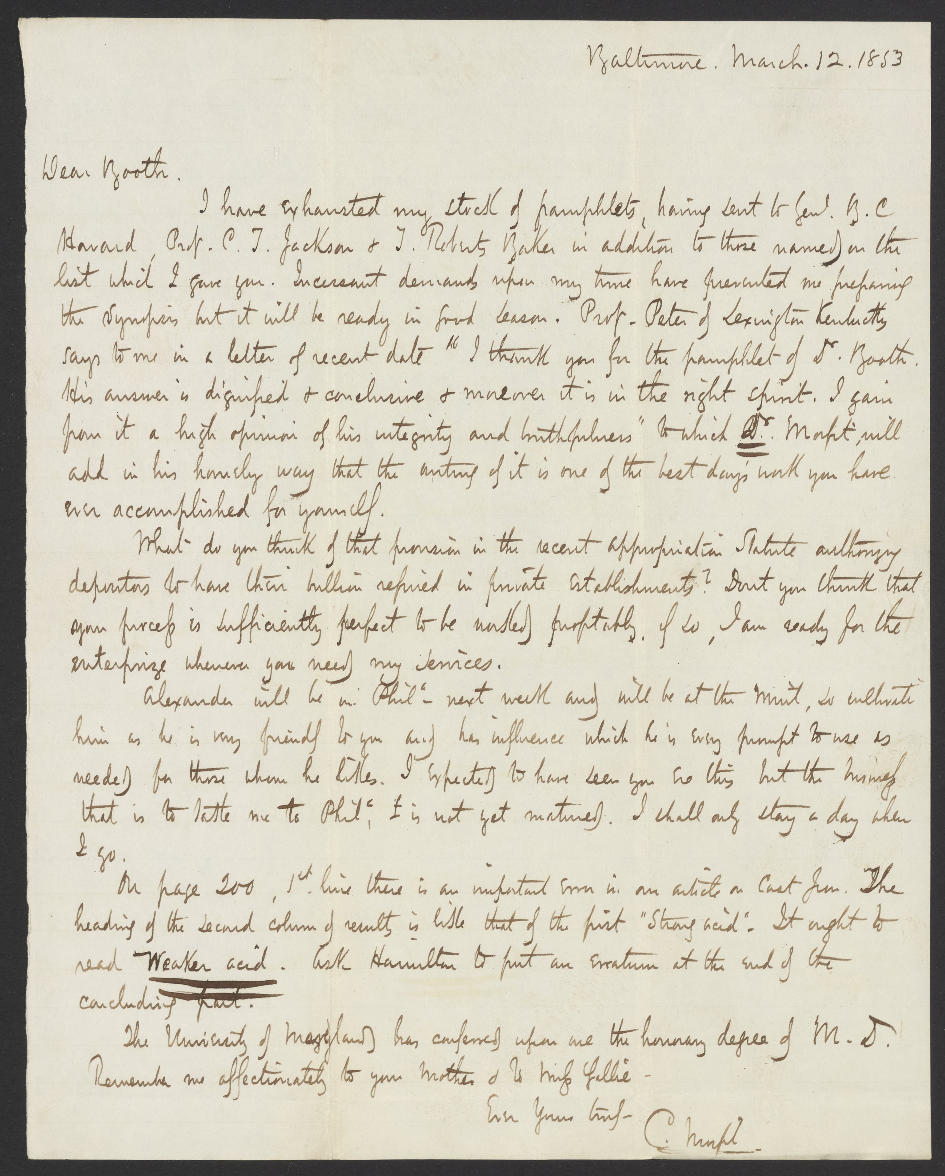 Letter from Campbell Morfit to James Curtis Booth, March 12, 1853