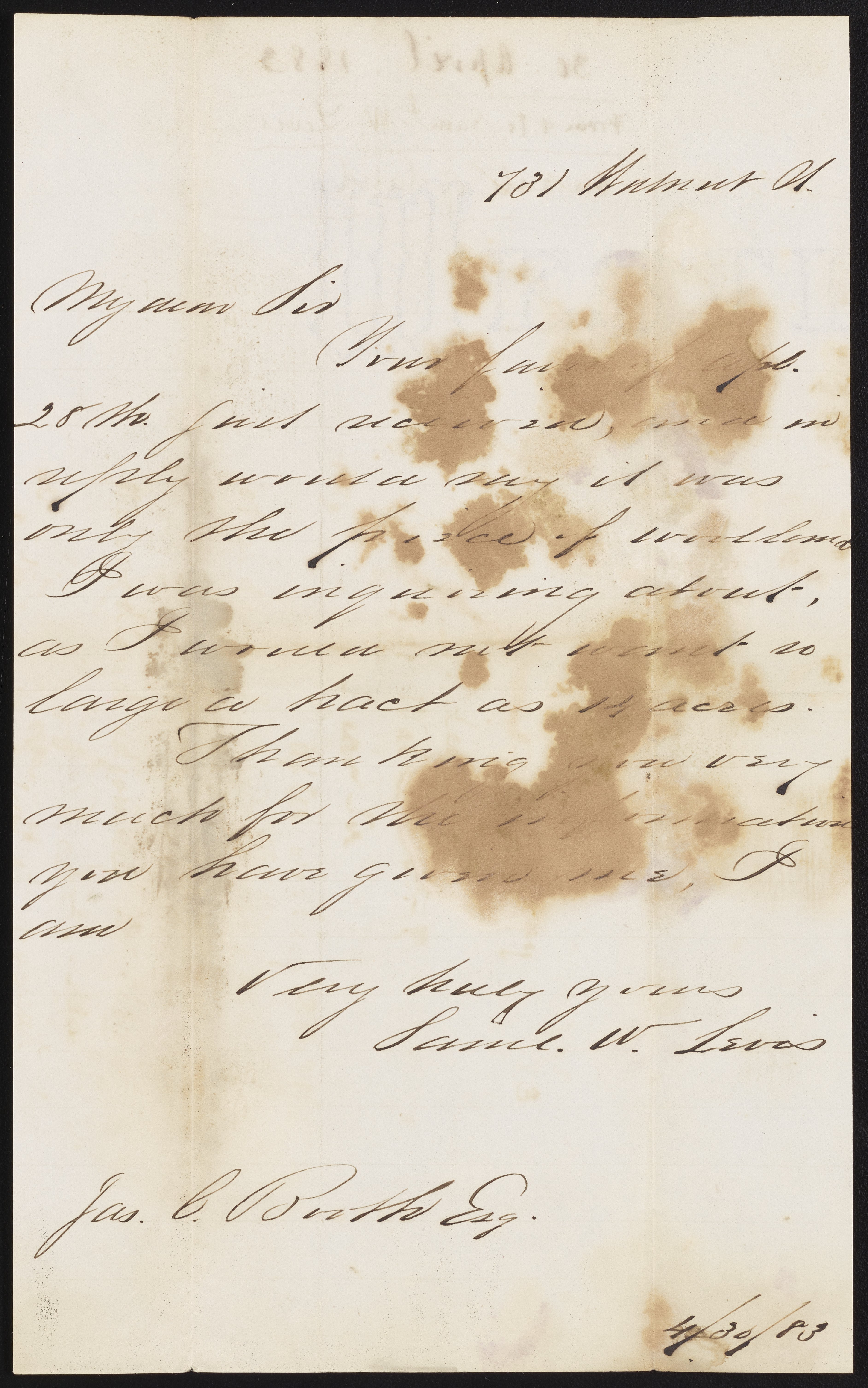 Small JPG1200 x 1918px — 309 KBLarge JPG2880 x 4603px — 1.7 MBFull-sized JPG3768 x 6022px — 2.8 MBOriginal fileTIFF — 3768 x 6022px — 65.0 MBSamuel W. Levis writes to James Curtis Booth (1810-1888) following his letter of early April to enquire after land for sale.