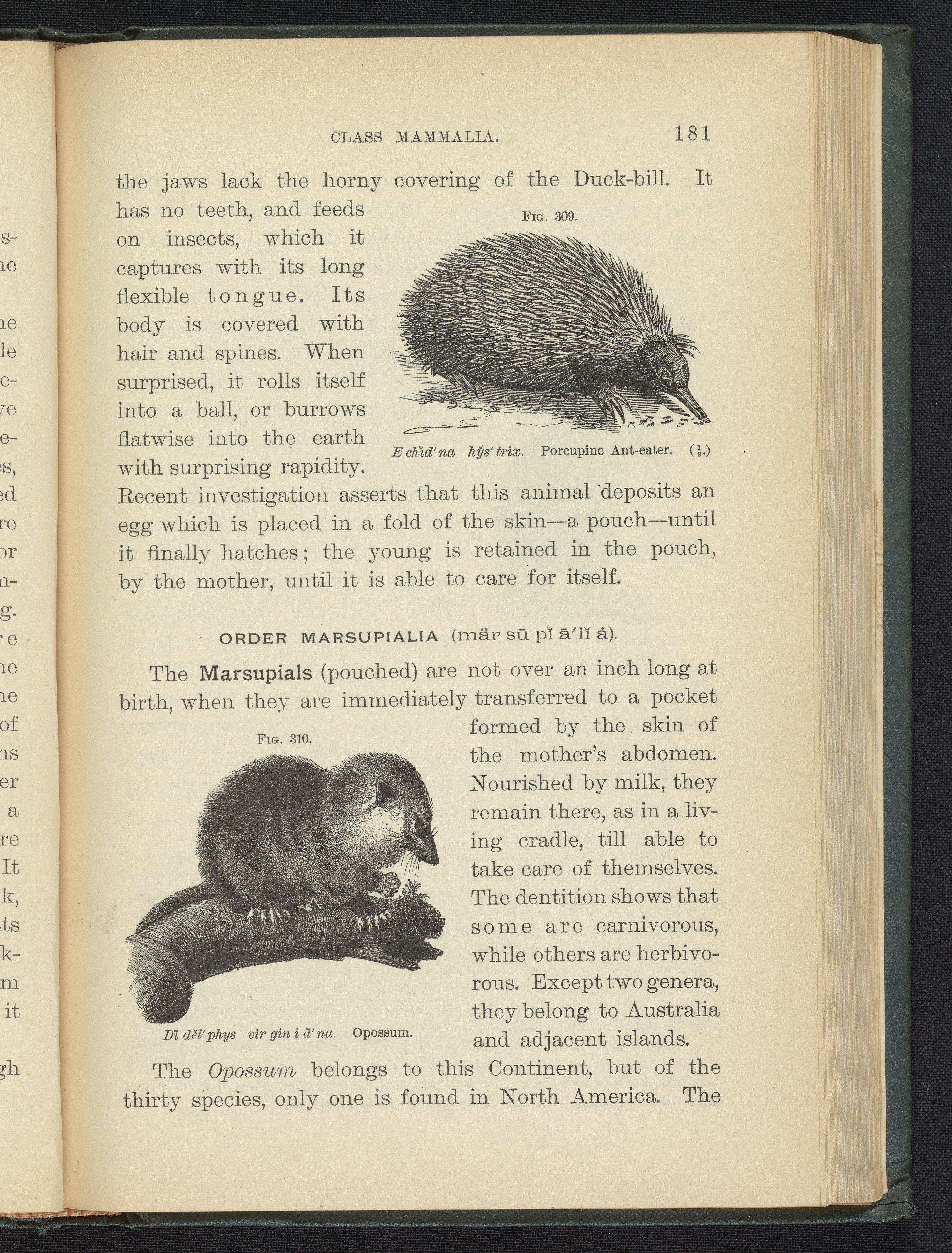 Steele, Joel Dorman, and Jenks, J. W. P. (John Whipple Potter). “Figure 309. Porcupine Ant-Eater. Figure 310. Opossum.” Popular Zoology. New York, New York: Chautauqua Press, 1887. https://digital.sciencehistory.org/works/n5ws6oe.