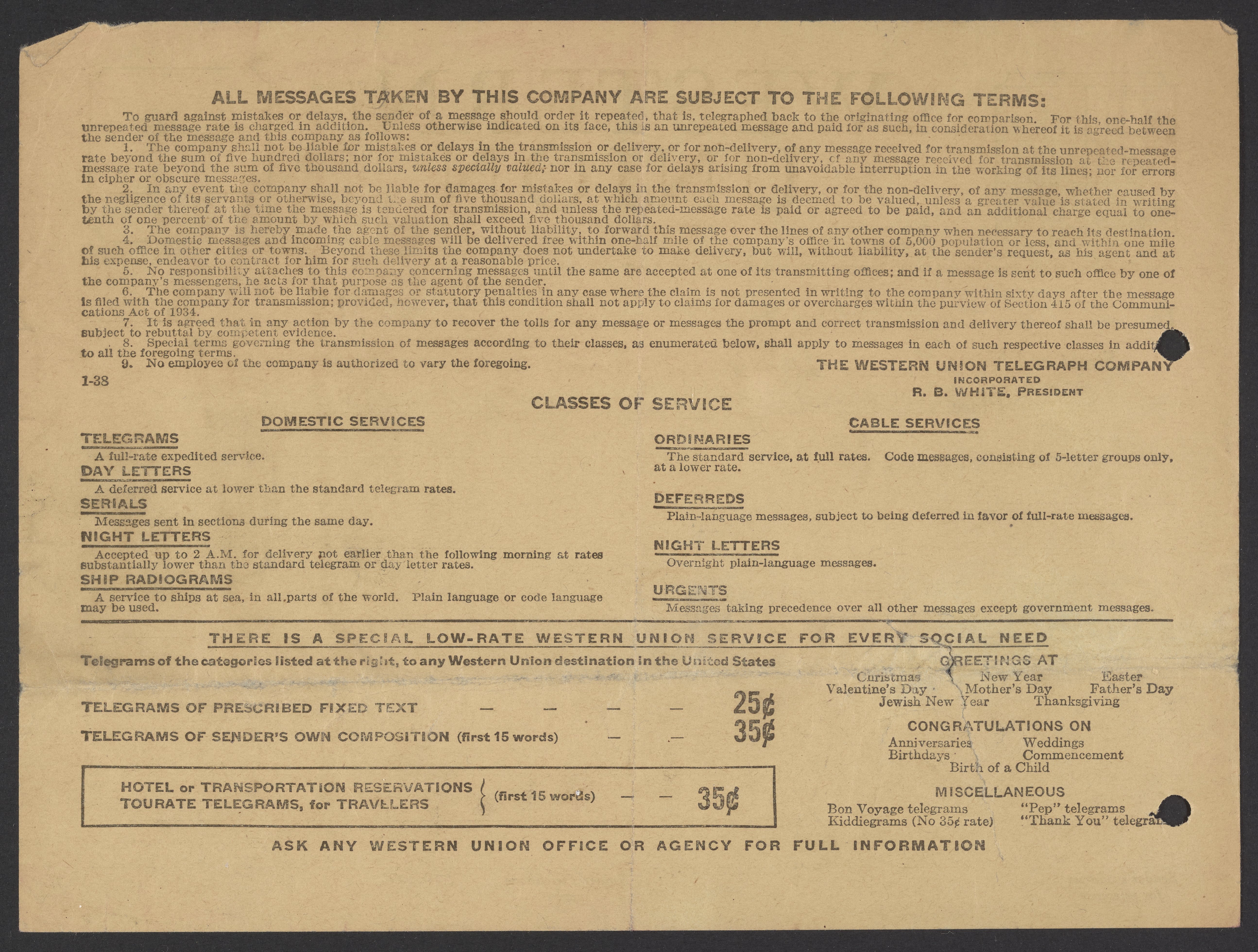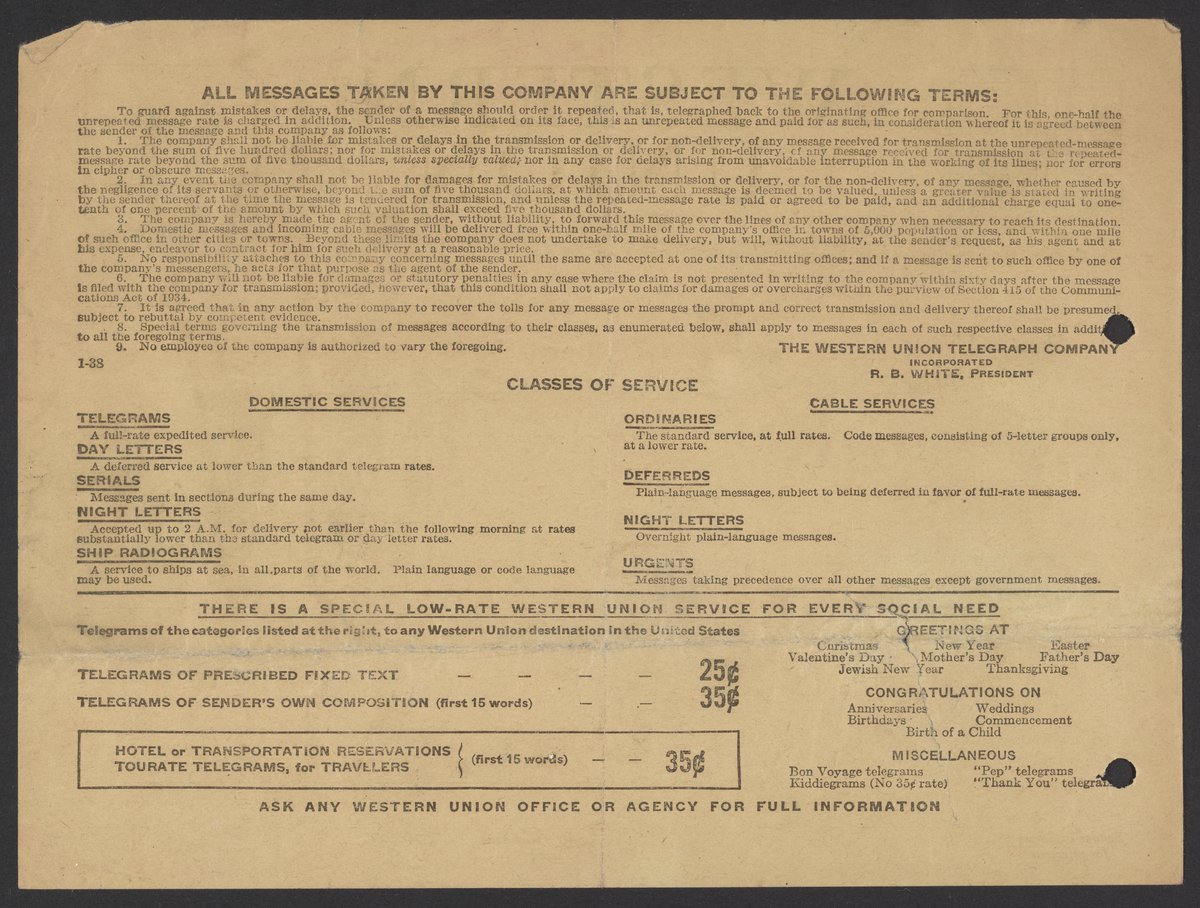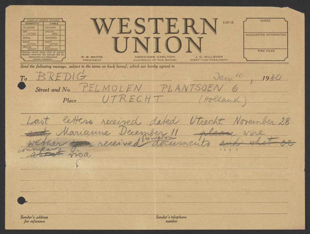 Bredig, Max Albert. “Telegram from Max Bredig to Georg Bredig, January 10. 1940,” January 10, 1940. Papers of Georg and Max Bredig, Box 1, Folder 23. Science History Institute. Philadelphia. https://digital.sciencehistory.org/works/n606zpg.