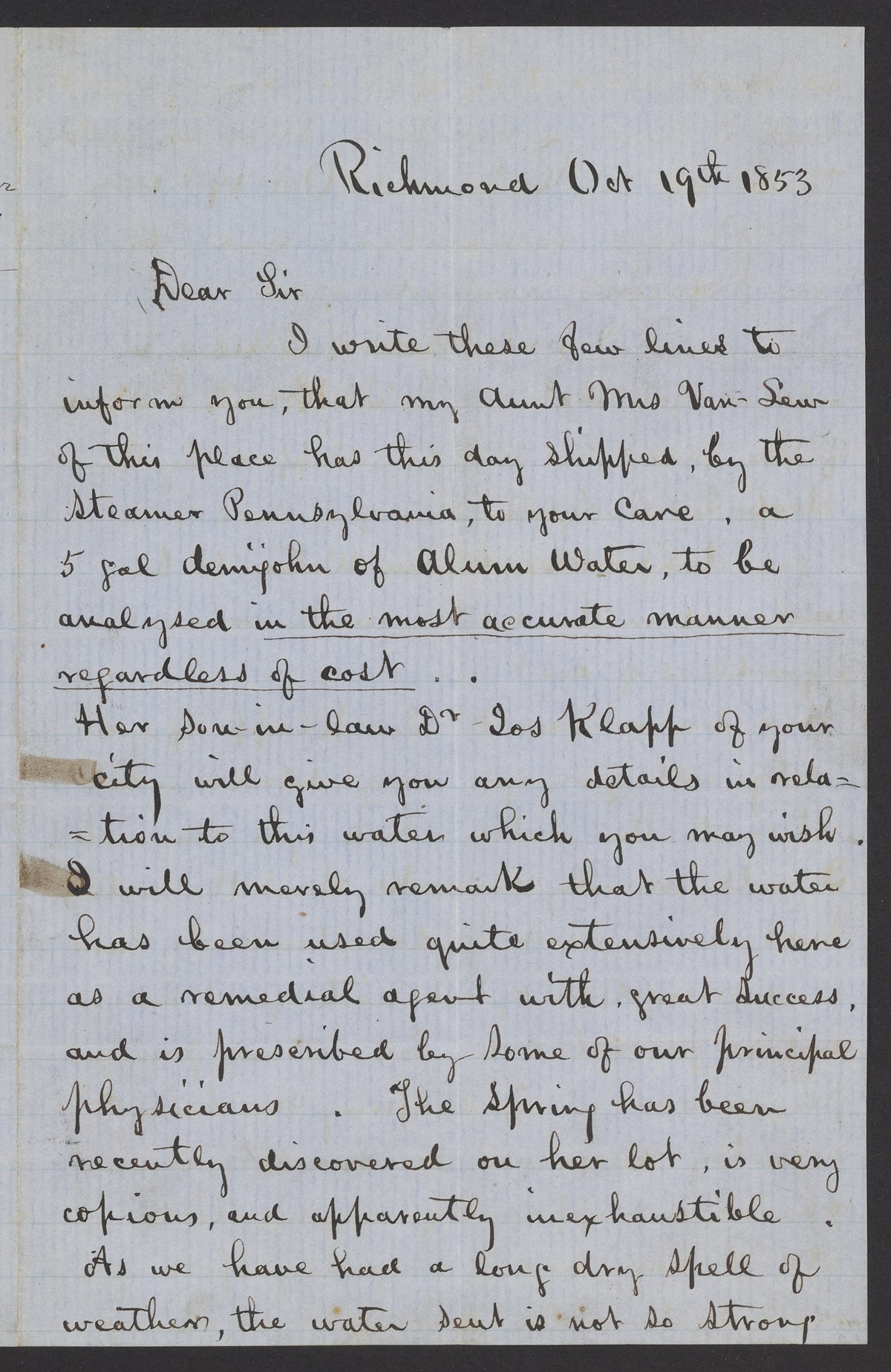 Small JPG1200 x 1849px — 402 KBFull-sized JPG2183 x 3363px — 1.1 MBOriginal fileTIFF — 2183 x 3363px — 21.1 MBHandwritten letter to James Curtis Booth (1810-1888) from the James Curtis Booth Papers. Booth, a nineteenth-century analytical chemist, established the first student training laboratory in 1836. He was also the chief melter and refiner of the U.S. Mint in Philadelphia. In his letter, Baker requests an analysis of a 5-gallon demijohn of alum water.