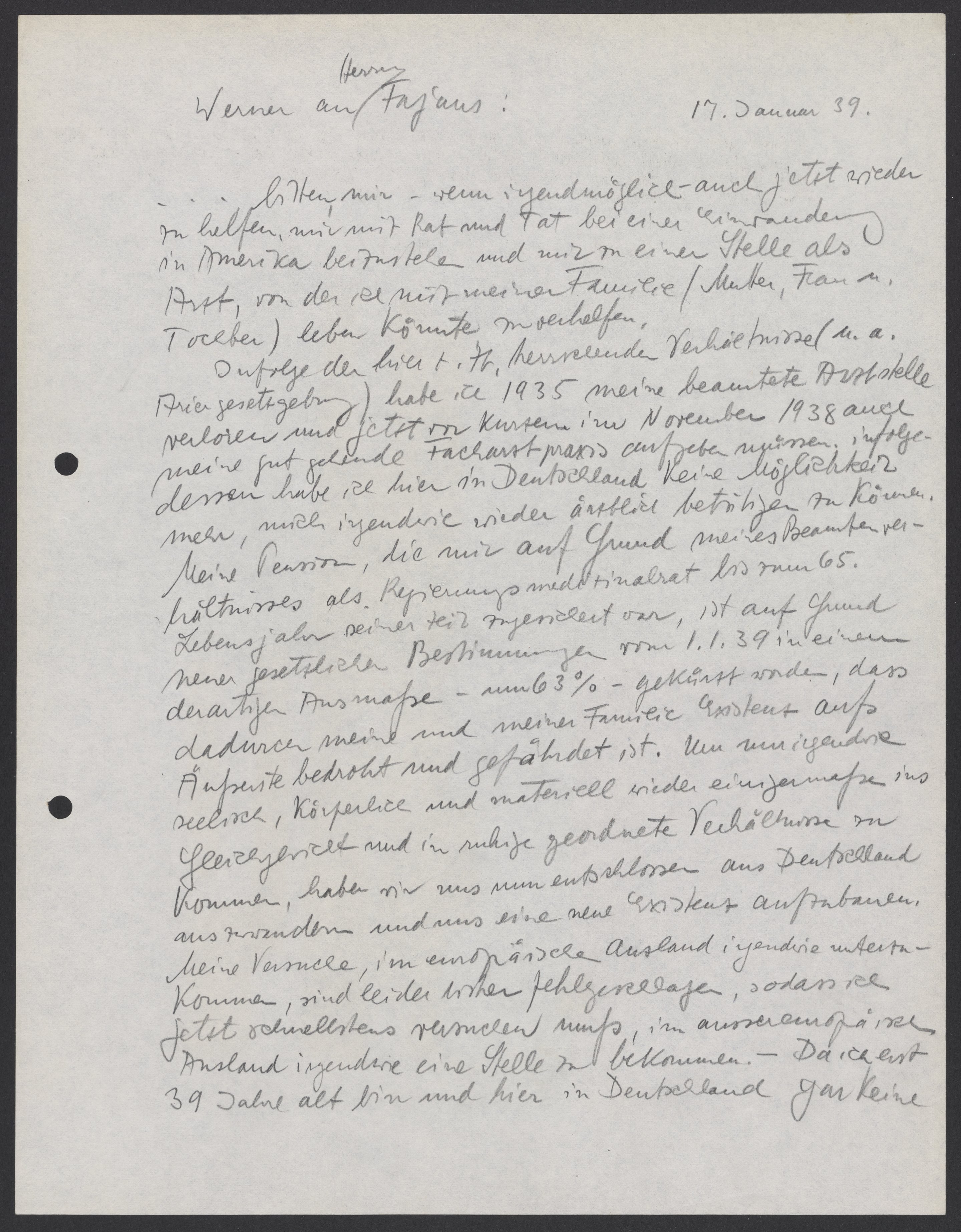 As a result of the circumstances prevailing here at the time, including Aryan laws, I lost my official position as a doctor in 1935. Moreover, recently, in November 1938, I also had to give up my specialist practice. As a result, I can no longer work as a doctor in any capacity here in Germany. My pension, which was supposed to be paid to me until my 65th birthday because of my civil service status as a government medical officer, has been reduced to such a great extent (by 63% - on the basis of new legal provisions beginning on January 1st, 1939), that the welfare of me and family have been threatened and endangered. In order to reclaim our emotional, physical, and financial wellbeing and move to a peaceful, orderly place, we have now decided to emigrate from Germany and build a new life for ourselves. Unfortunately, my attempts to find somewhere to work in other European countries have so far failed. Therefore, I must now try to find a job somewhere outside of Europe as quickly as possible. Because I'm only 39 years old and I don’t have any (connections) here in Germany….