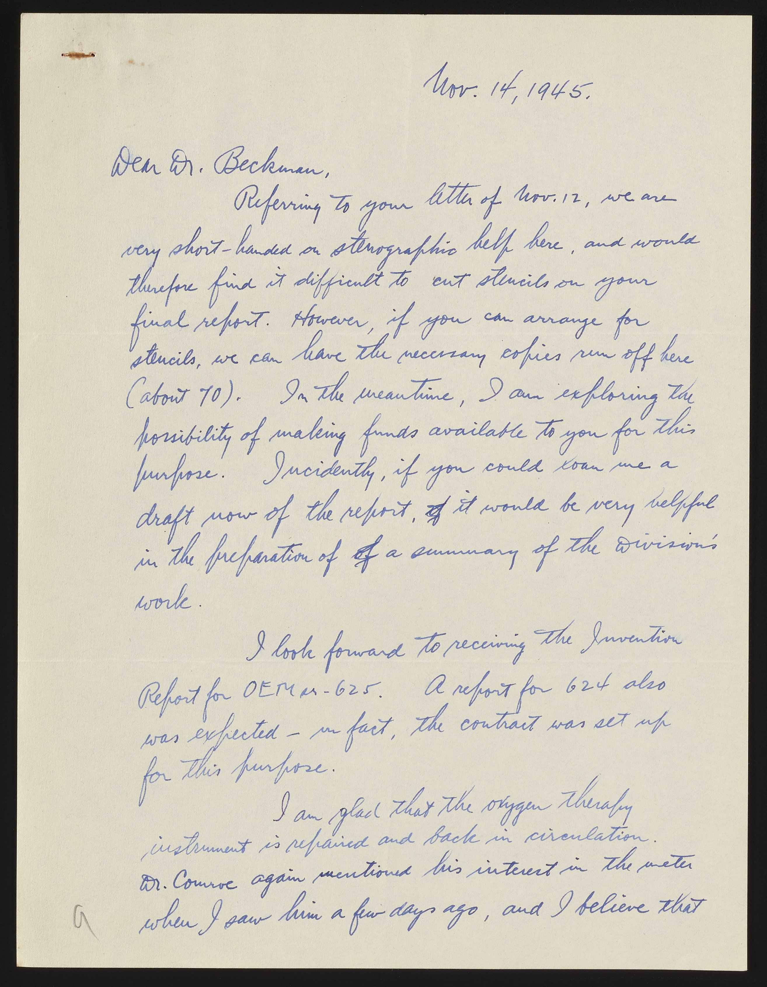 Prentiss, Spencer S. “Letter from S. S. Prentiss to Arnold O. Beckman,” November 14, 1945. Beckman Historical Collection, Box 19, Folder 8. Science History Institute. Philadelphia. https://digital.sciencehistory.org/works/n870zr22b.