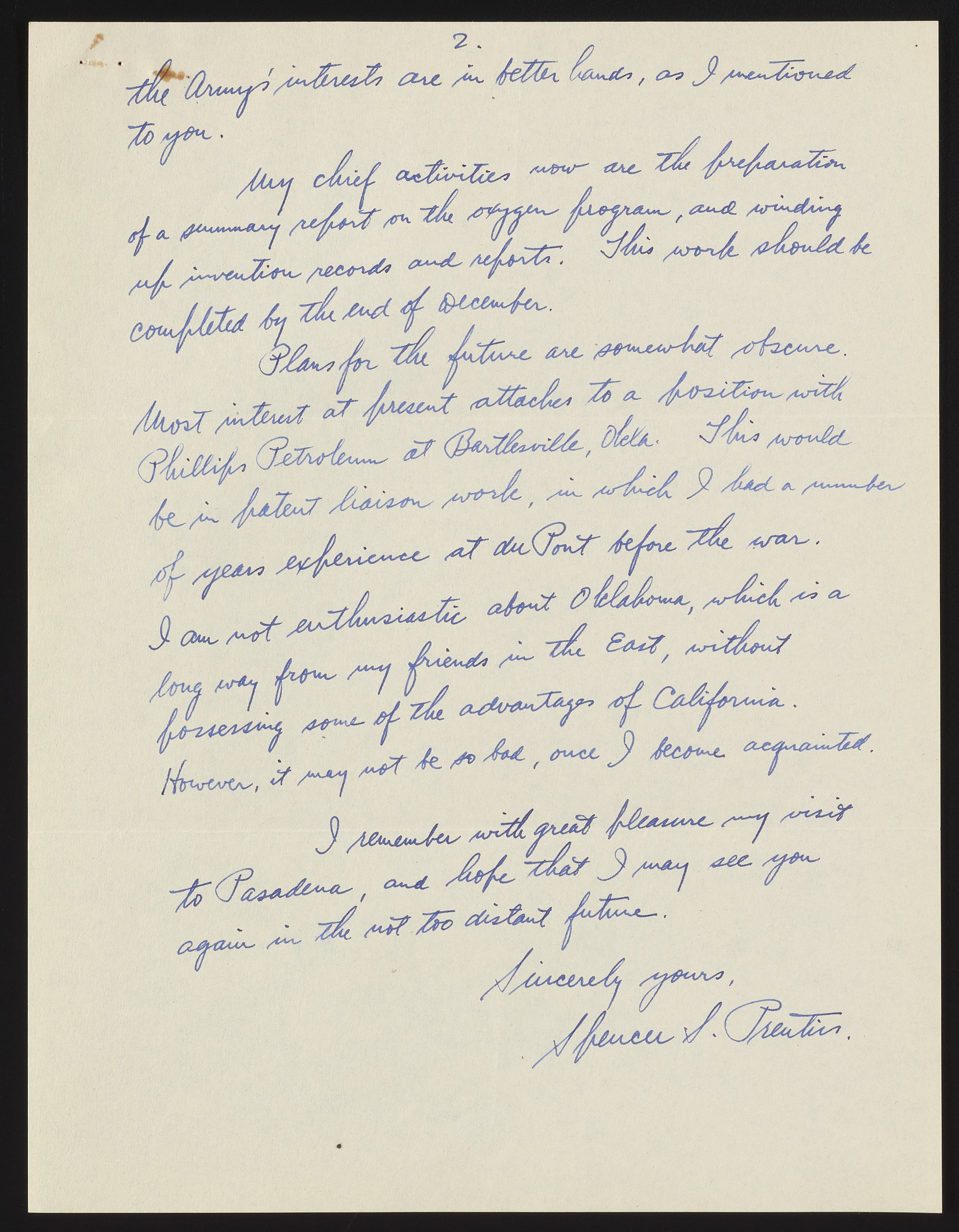 Small JPG1200 x 1543px — 279 KBFull-sized JPG2628 x 3380px — 1.2 MBOriginal fileTIFF — 2628 x 3380px — 25.5 MBIn this handwritten letter, Prentiss discusses reports on the oxygen meter contracts and the possibility of working for Phillips Petroleum, despite his lack of enthusiasm for relocating to Oklahoma.