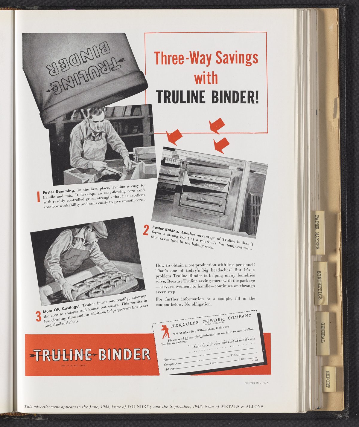 Hercules Incorporated. “Three-Way Savings with Truline Binder!” 1943 Hercules Advertisements, 1943. Records of Hercules Incorporated, Volume 1943. Science History Institute. Philadelphia. https://digital.sciencehistory.org/works/n870zr39h.