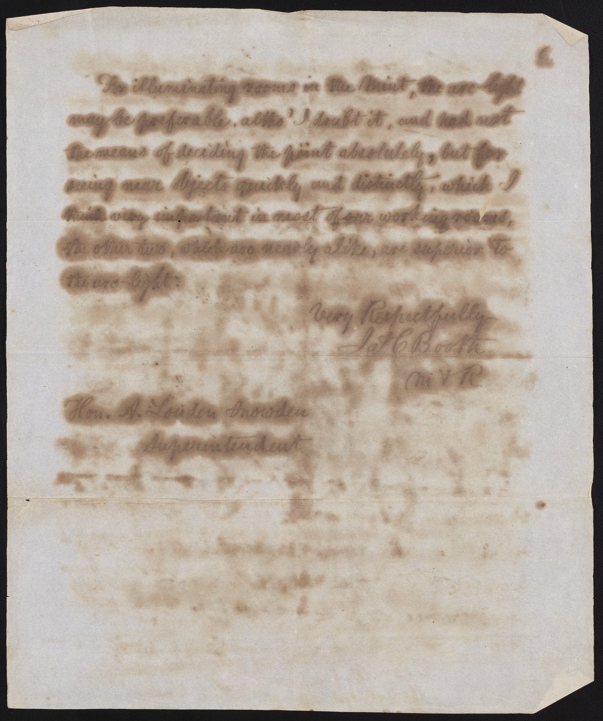 Small JPG1200 x 1428px — 245 KBLarge JPG2880 x 3426px — 1.6 MBFull-sized JPG4928 x 5863px — 4.5 MBOriginal fileTIFF — 4928 x 5863px — 82.7 MBJames Curtis Booth (1810-1888) writes to Archibald Loudon Snowden (1835-1912), Superintendent of the United States Mint at Philadelphia from 1879 to 1885, regarding a report on electric lights.