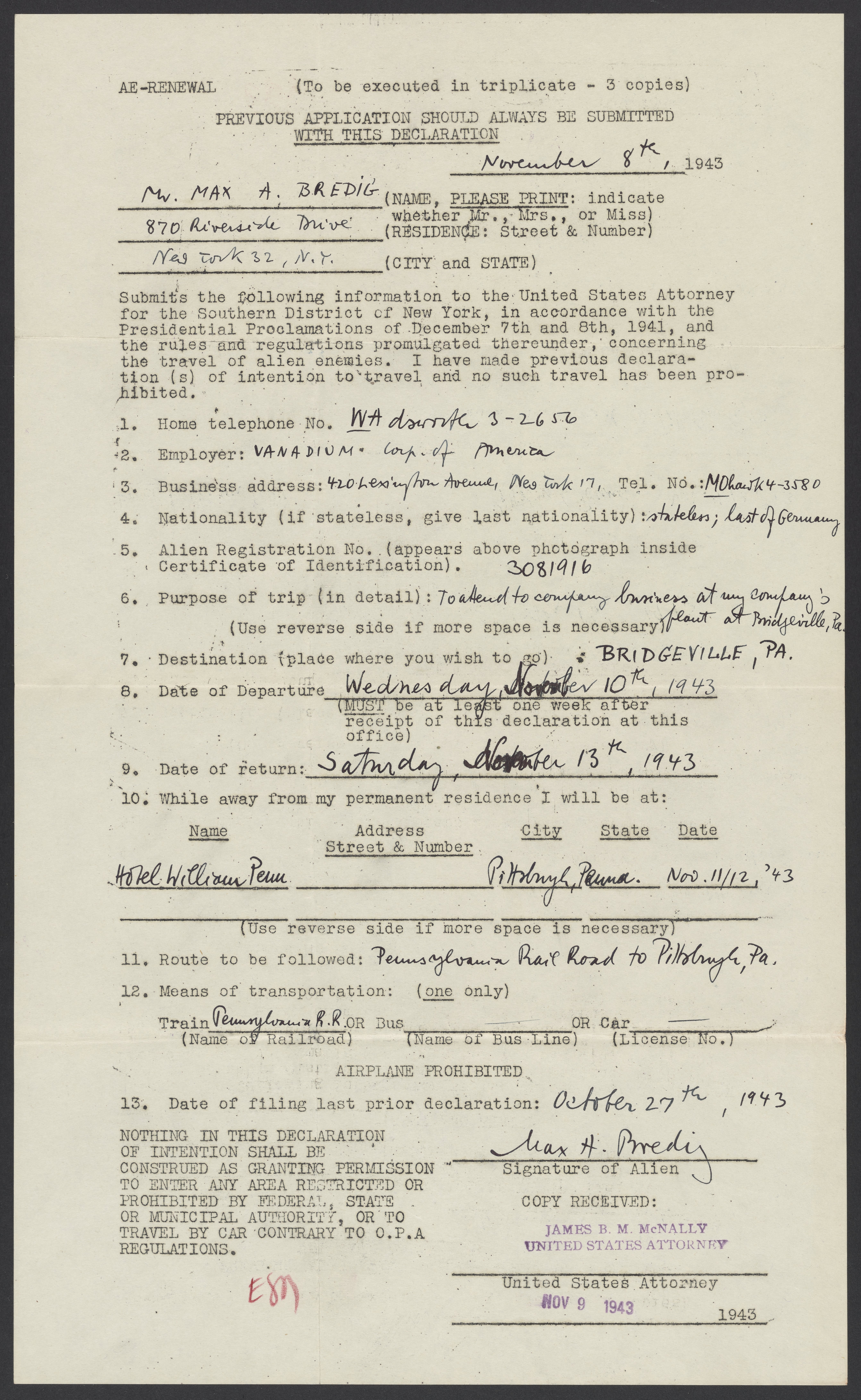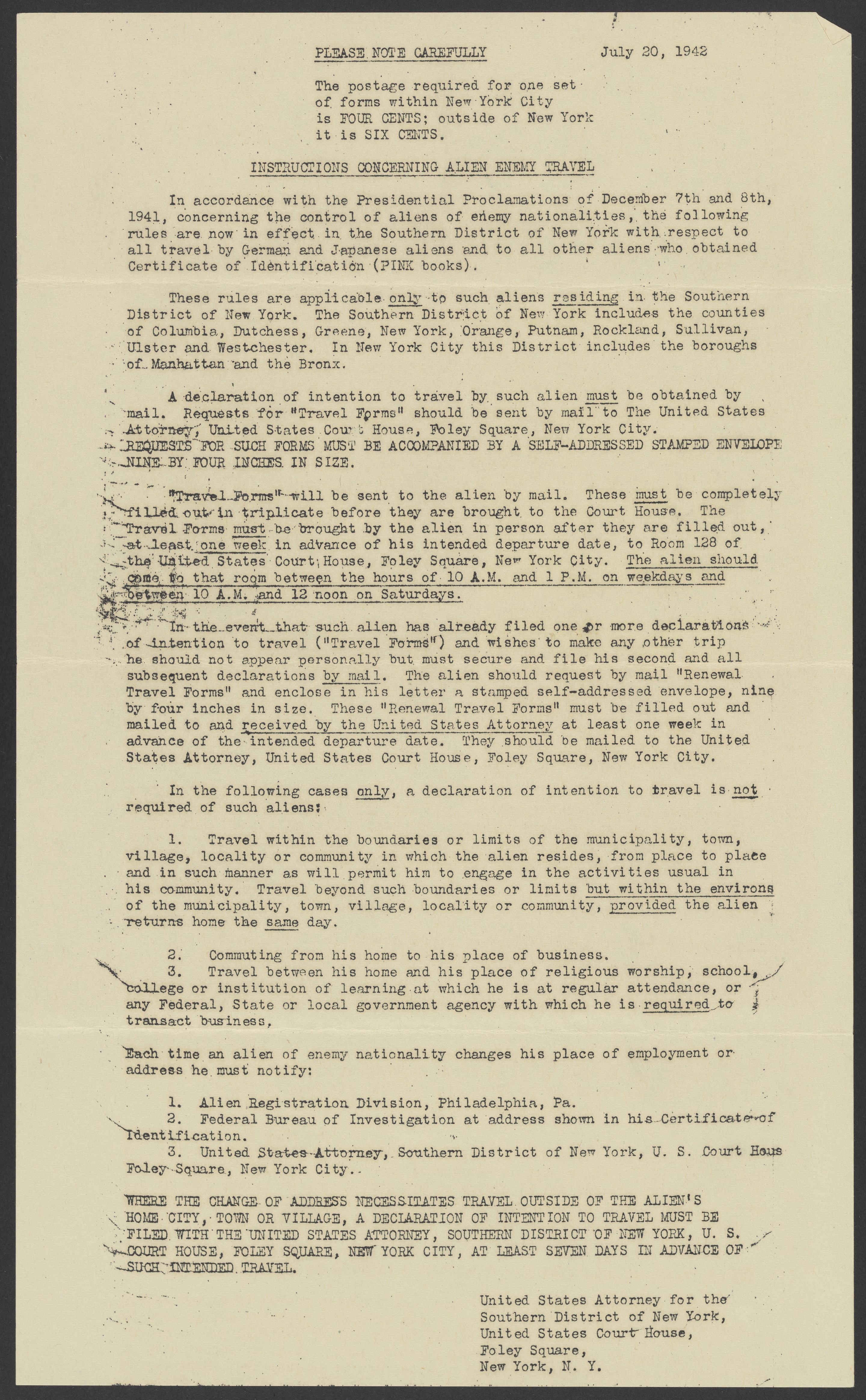 United States. District Attorney (New York : Southern District). “Instructions Concerning Alien Enemy Travel,” 1942–1943. Papers of Georg and Max Bredig, Box 7, Folder 27. Science History Institute. Philadelphia. https://digital.sciencehistory.org/works/n9gpq4t.