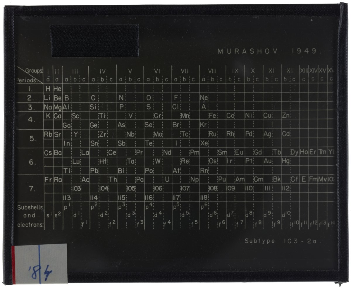Murashov, G.M., and Edward G. Mazurs. “Series Table Organized into Sixteen Groups.” Glass (material), circa 1949–1957. Edward G. Mazurs Collection of Periodic Systems Images, Box 1. Science History Institute. Philadelphia. https://digital.sciencehistory.org/works/nc580n106.