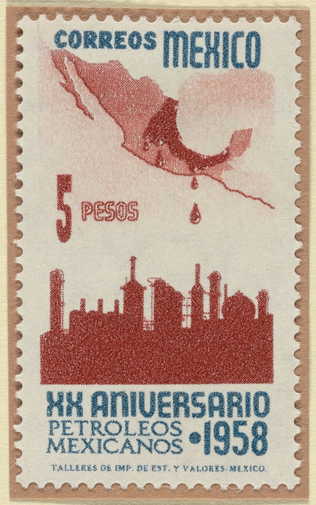 Mexico. Dirección General de Talleres de Impresión de Estampillas y Valores. “Mexican Postage Stamp Commemorating Aniversario Petróleos Mexicanos (20th Anniversary),” 1958. Witco Stamp Collection, Box 7. Science History Institute. Philadelphia. https://digital.sciencehistory.org/works/ncbynep.