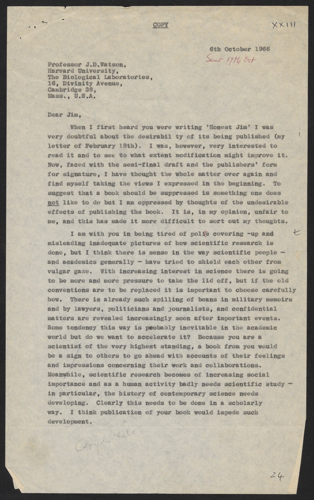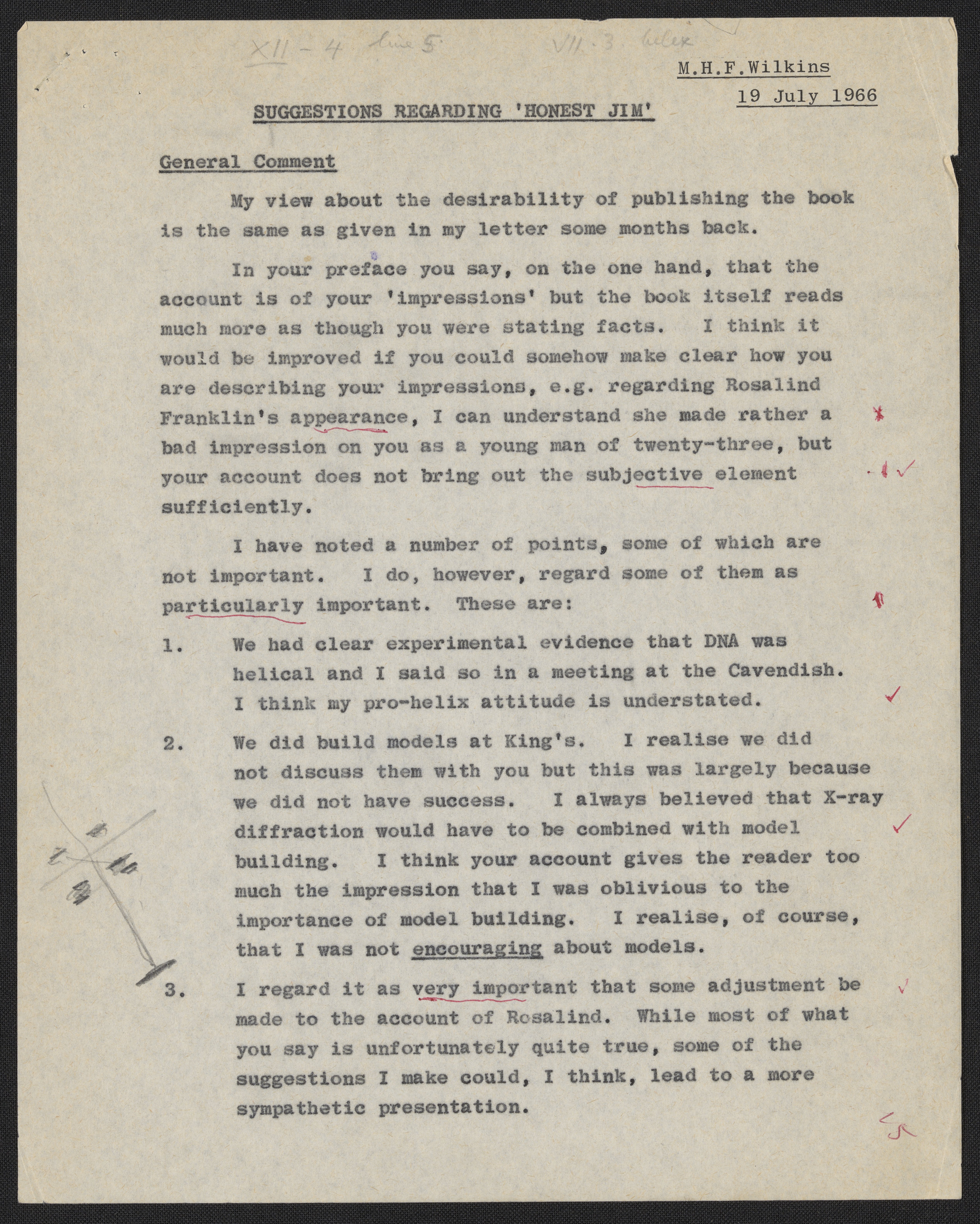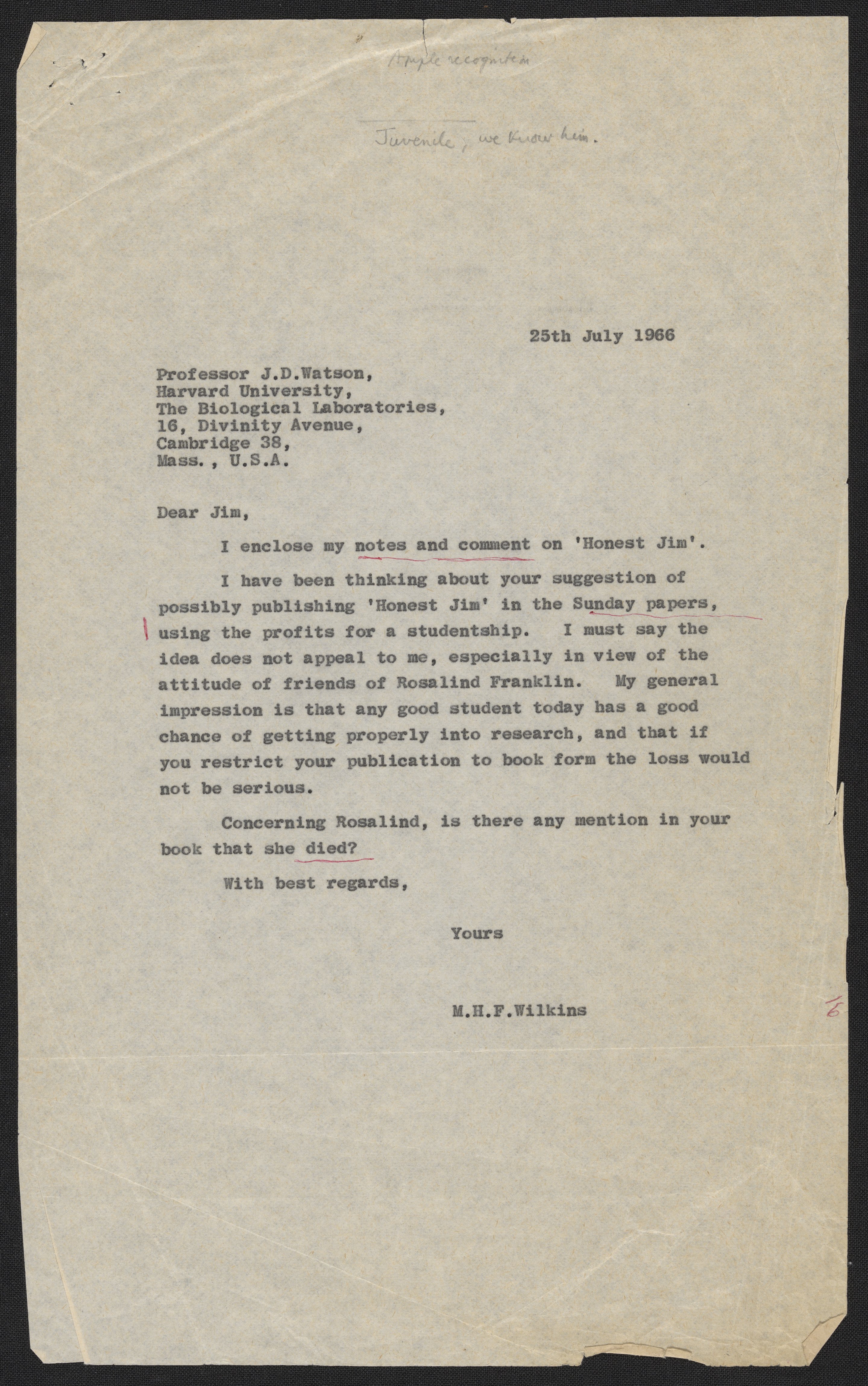 Letters and notes on "Honest Jim" from Maurice Wilkins to James D. Watson, July 1966