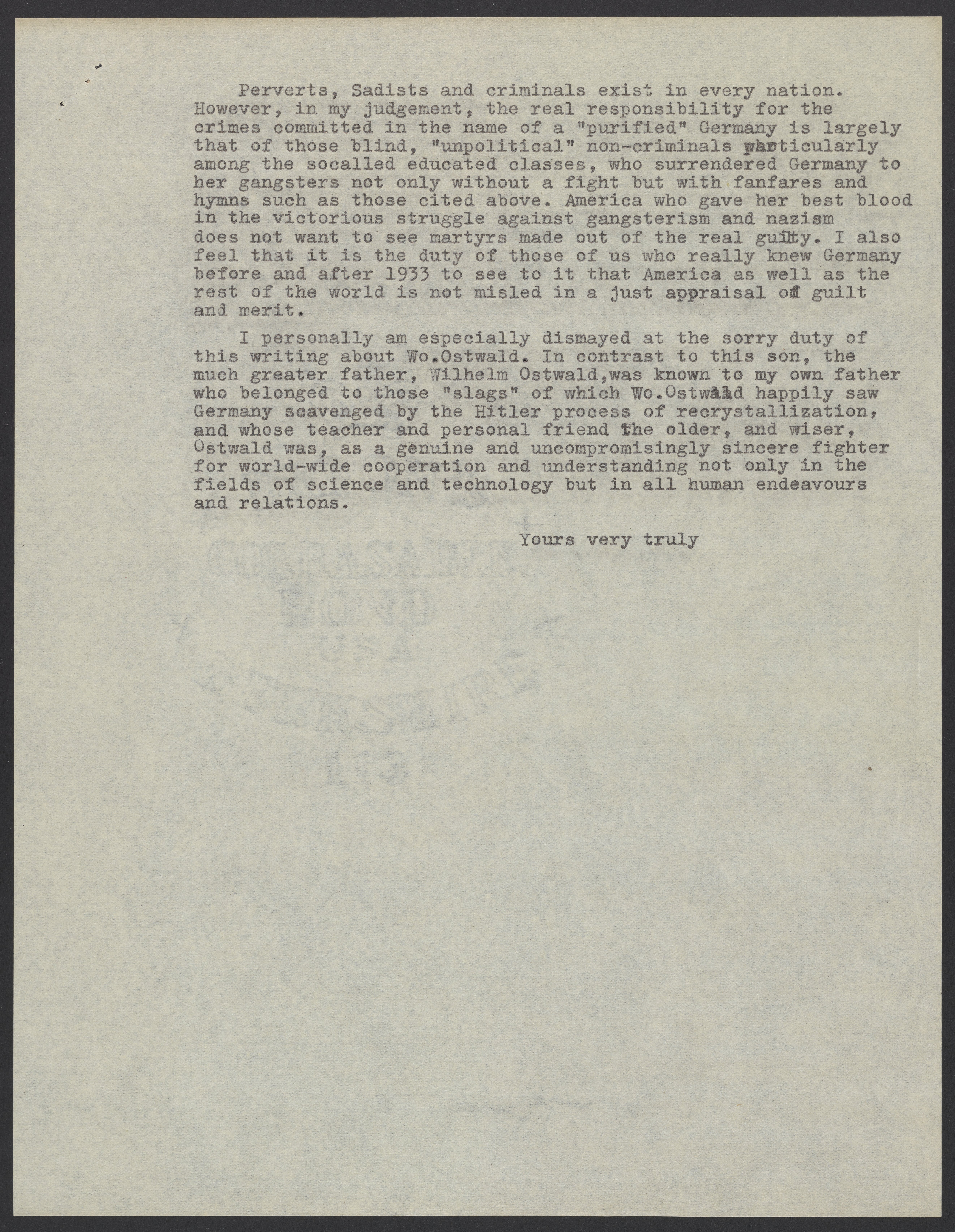 Small JPG1200 x 1539px — 345 KBLarge JPG2880 x 3693px — 2.1 MBFull-sized JPG5301 x 6797px — 6.8 MBOriginal fileTIFF — 5301 x 6797px — 103 MBMax Bredig (1902-1977) writes to Ernst A. Hauser (1896-1956) about Hauser's recent response to Wolfgang Ostwald's (1883–1943) obituary. Bredig posits that Ostwald either "behaved like or became a Nazi under the Hitler regime" and that this should have been noted in his obituary. Bredig includes evidence of this in his letter such as quotes from Ostwald's speeches and times he had been seen wearing a swastika.