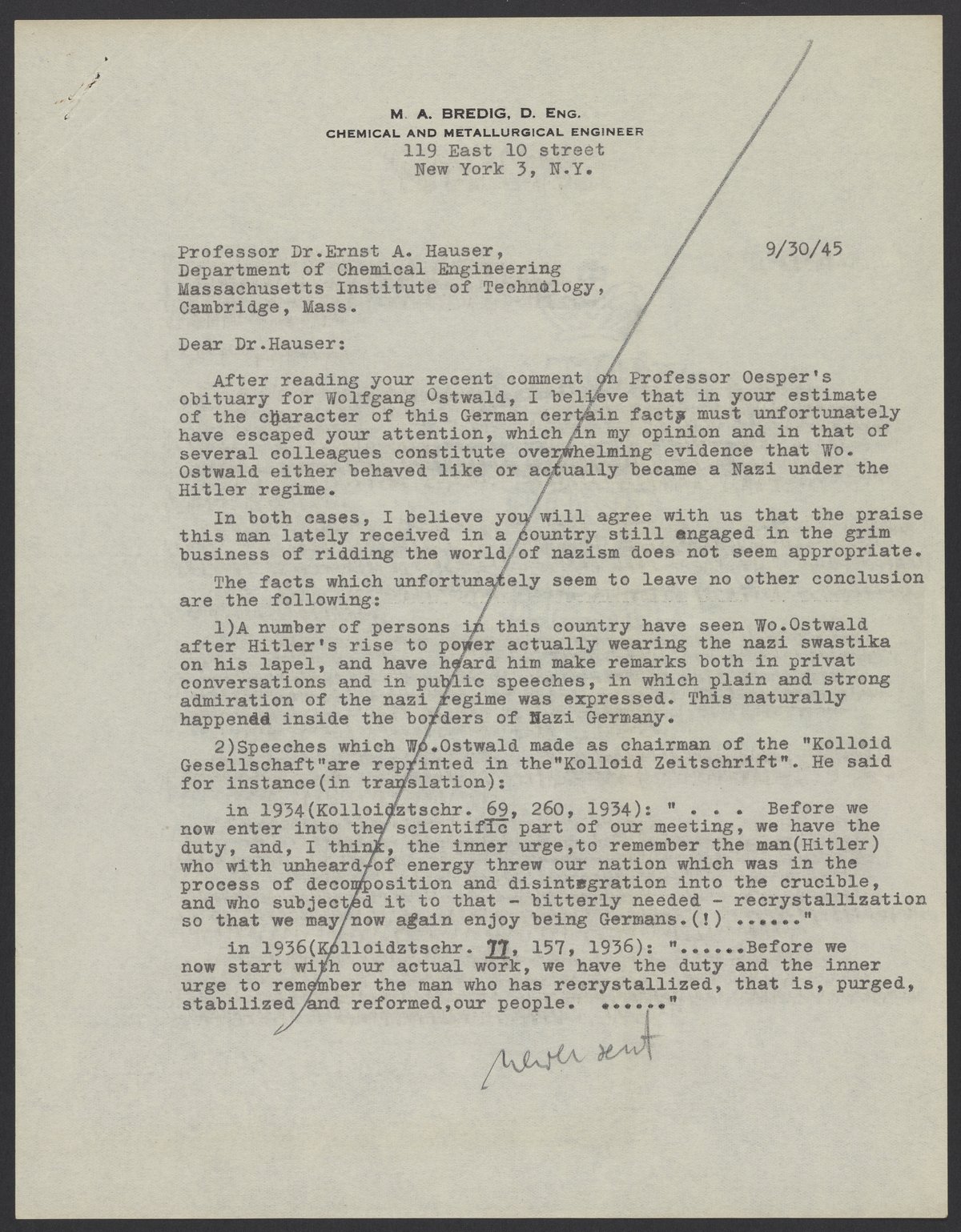 Bredig, Max Albert. “Letter from Max Bredig to Ernst A. Hauser, September 30, 1945,” September 30, 1945. Papers of Georg and Max Bredig, Box 7, Folder 30. Science History Institute. Philadelphia. https://digital.sciencehistory.org/works/ndh0pn5.