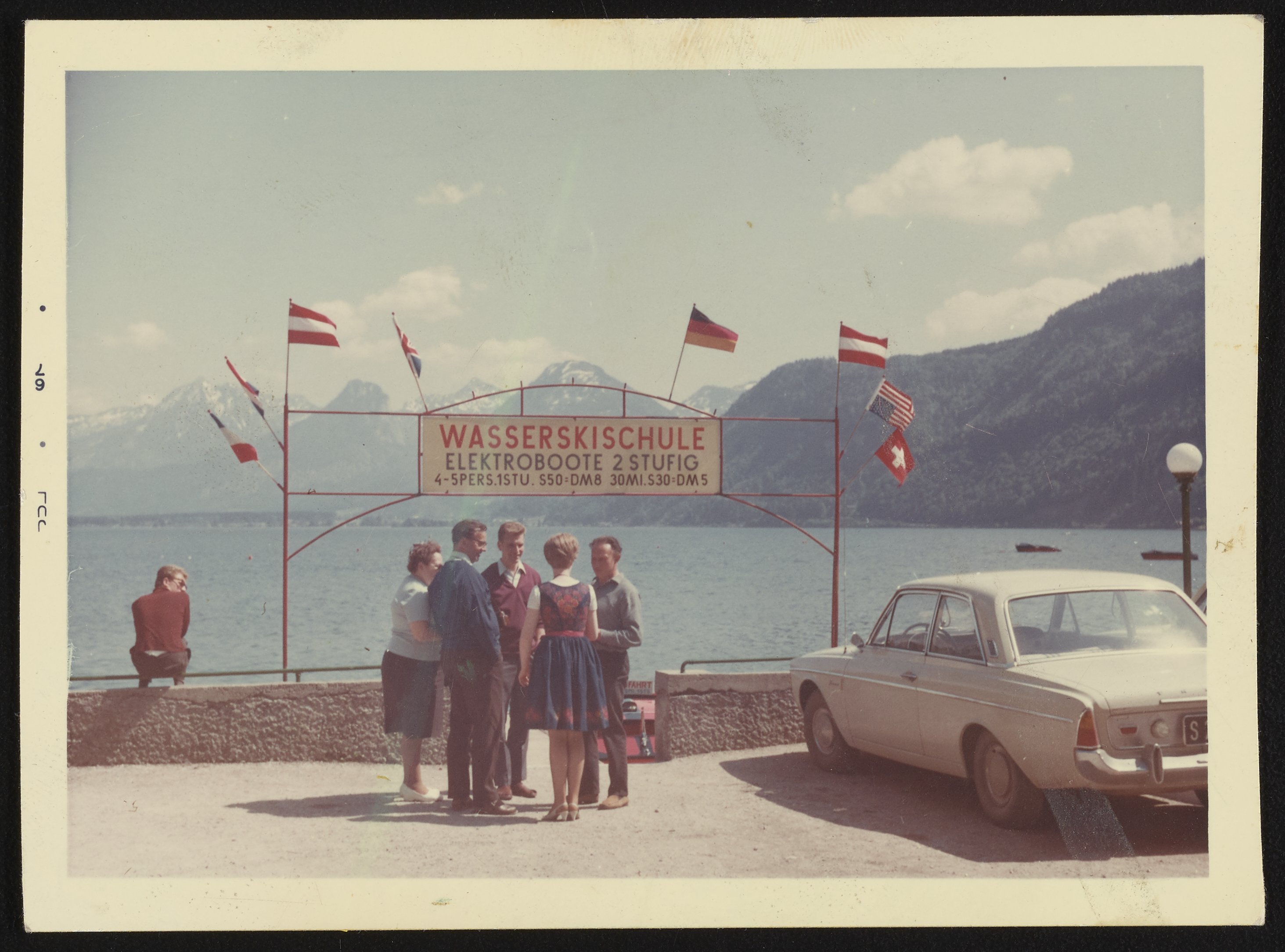 Small JPG1200 x 889px — 131 KBLarge JPG2880 x 2133px — 568 KBFull-sized JPG2927 x 2168px — 581 KBOriginal fileTIFF — 2927 x 2168px — 18.2 MBA color photograph depicting six people in front of Lake St. Wolfgang in St. Gilgen, Austria. A group of five stands in front of a sign advertising "wasserskischule / elektroboote 2 stufig" or "water ski school / electric boats 2 levels." One man is seated nearer to the lake.