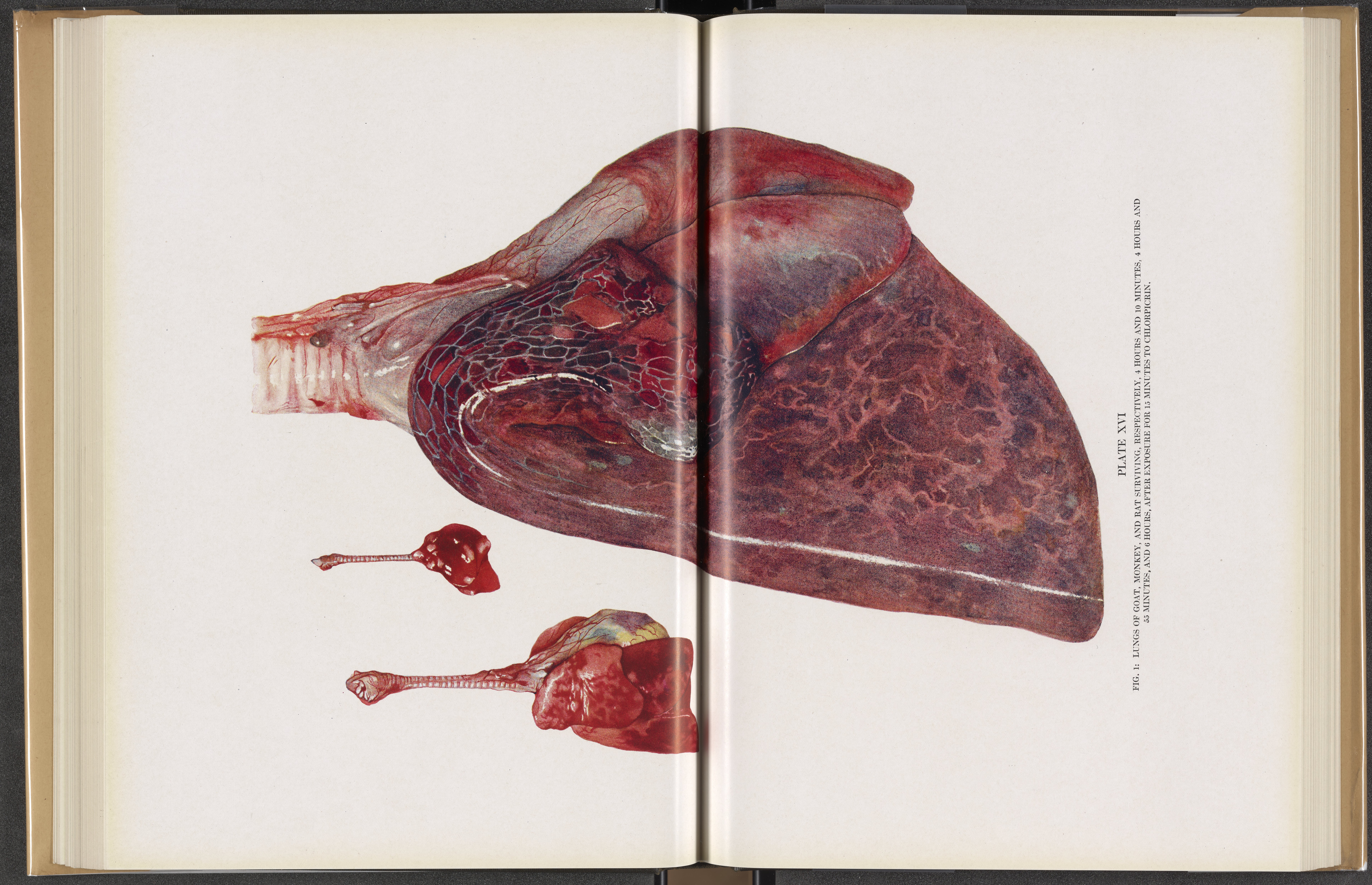 Plate XVI (Fig. 1): Lungs of goat, monkey, and rat surviving, respectively, 4 hours and 10 minutes, 4 hours and 55 minutes, and 6 hours, after exposure for 15 minutes to chlorpicrin.
