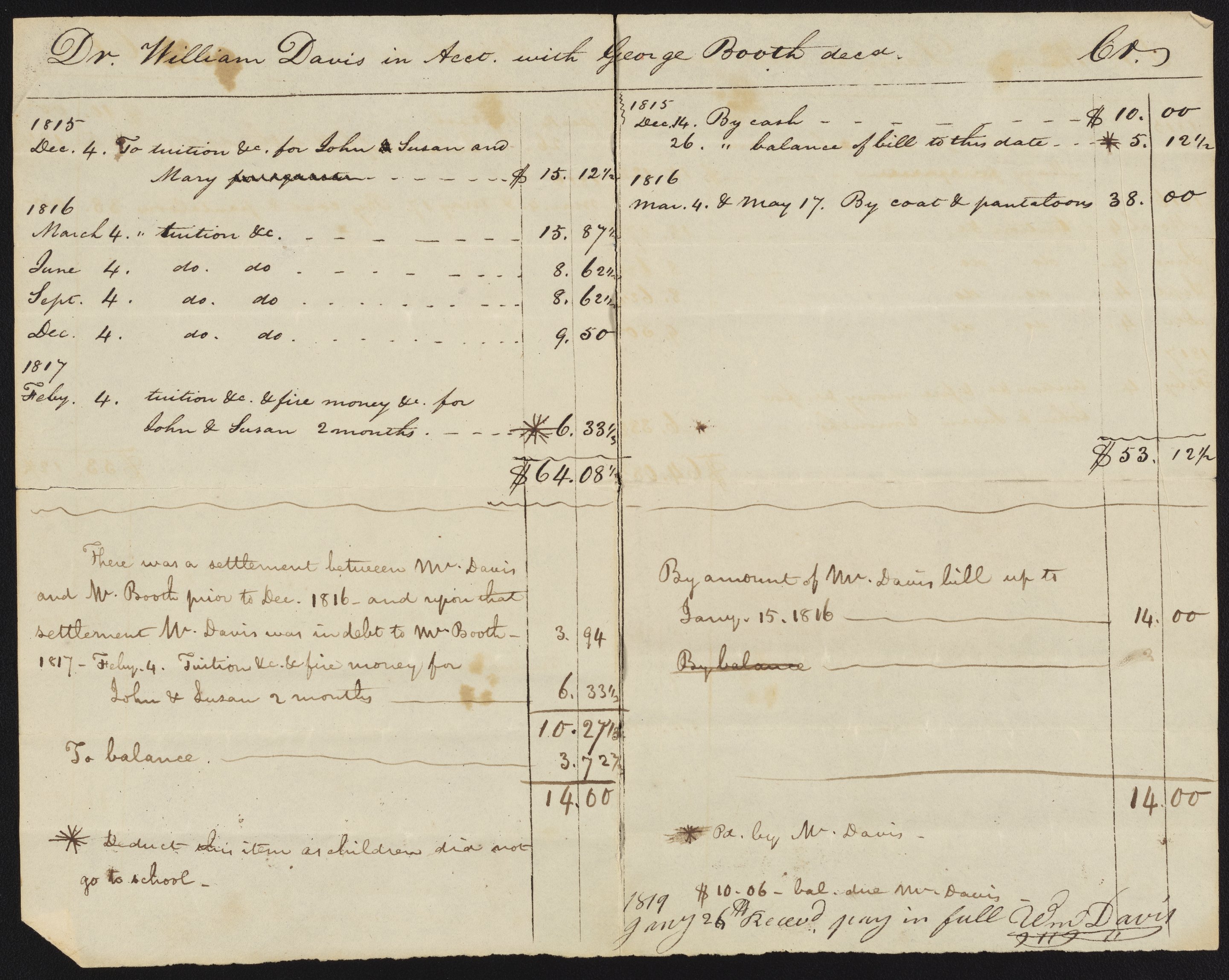 Dr. William Davis in Account with George Booth, Deceased