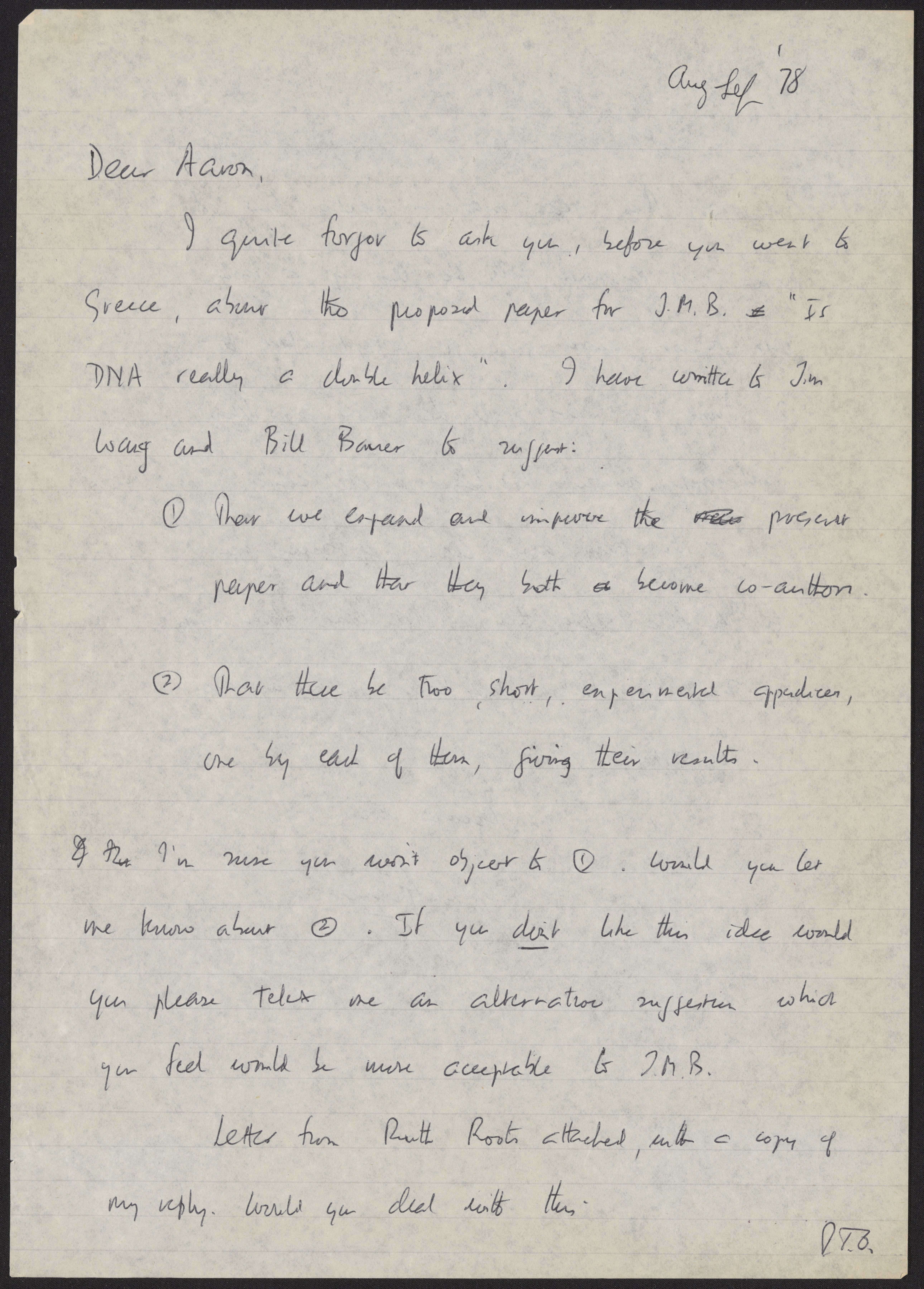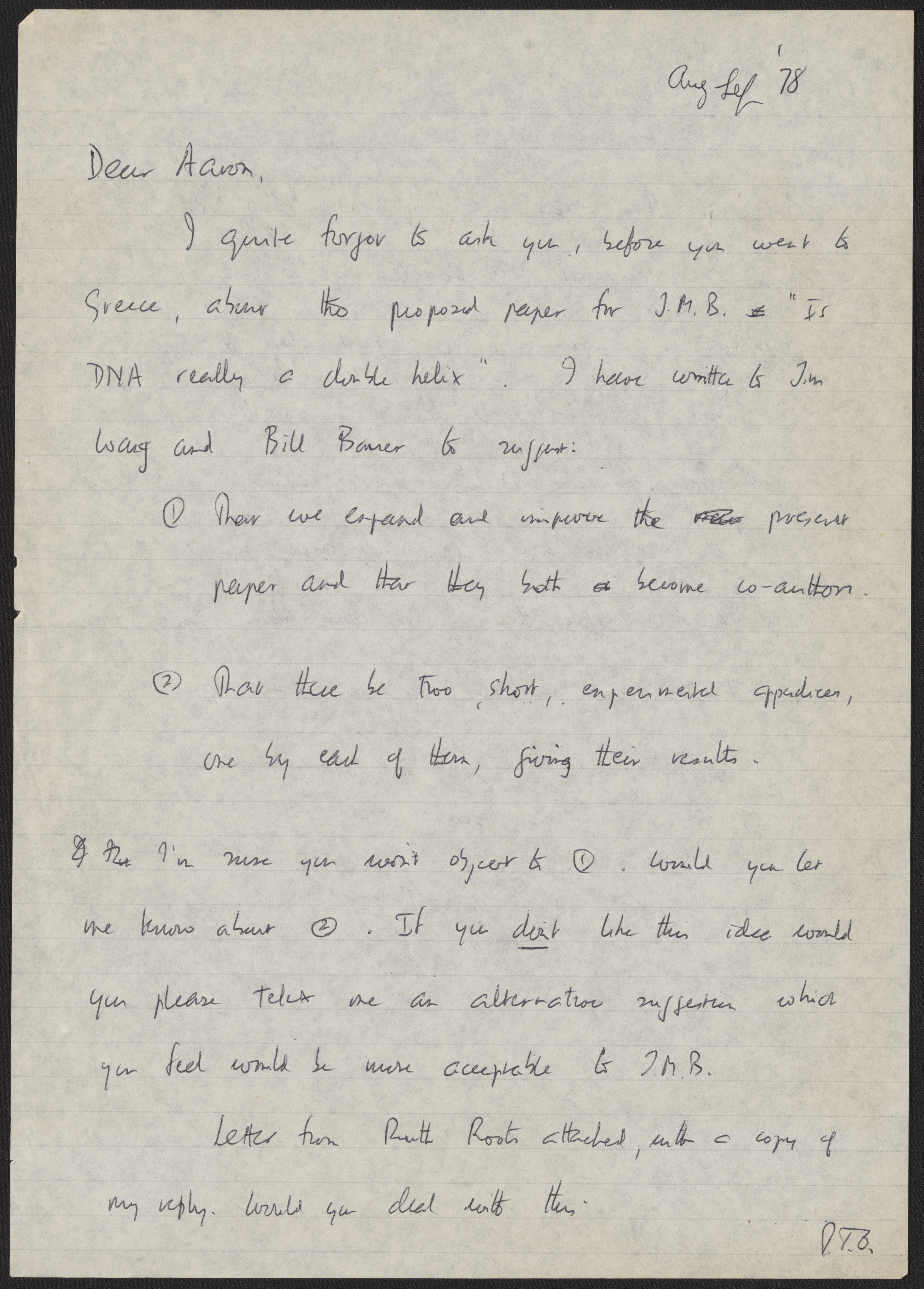 Letter from Francis Crick to Aaron Klug, August, 1978