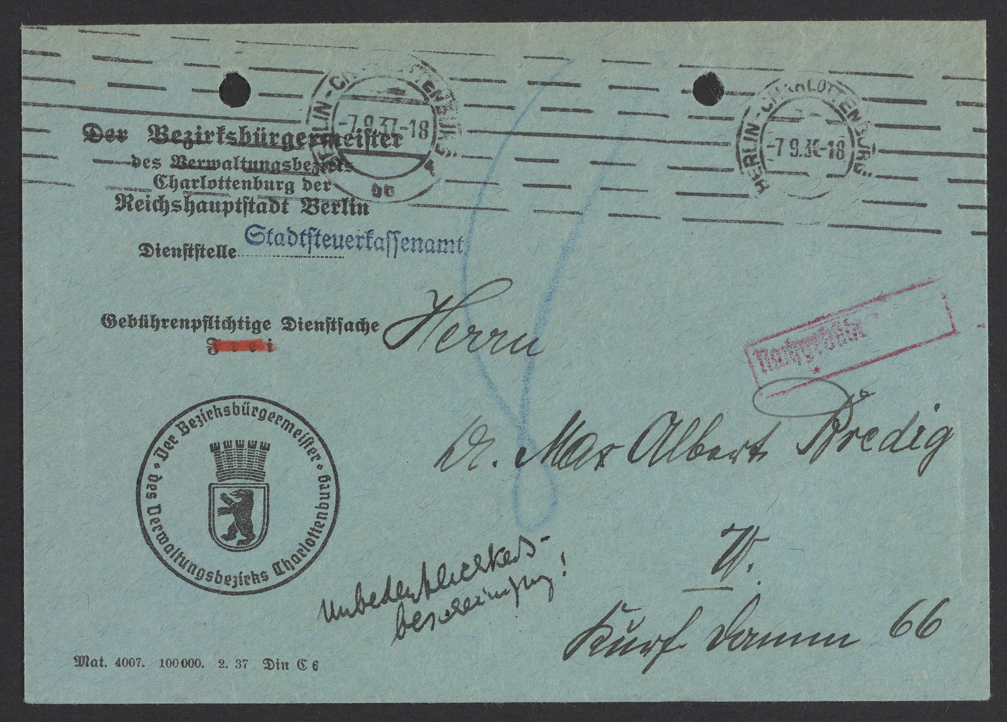 Postcard from the Mayor of Charlottenburg to Max Bredig, September 1937