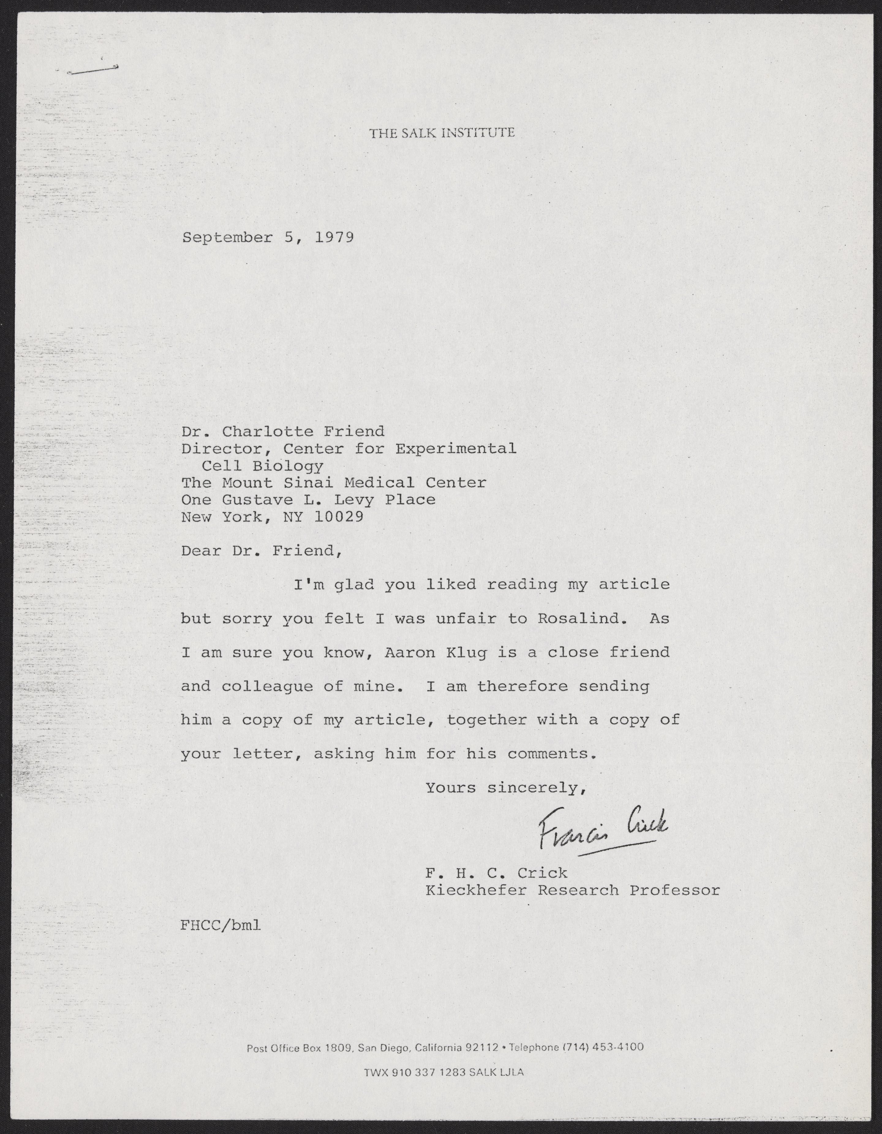 Crick, Francis. “Letter from Francis Crick to Charlotte Friend, September 5, 1979,” September 5, 1979. History of Molecular Biology Collection, Box 20, Folder 3. Science History Institute. Philadelphia. https://digital.sciencehistory.org/works/njmcqgm.