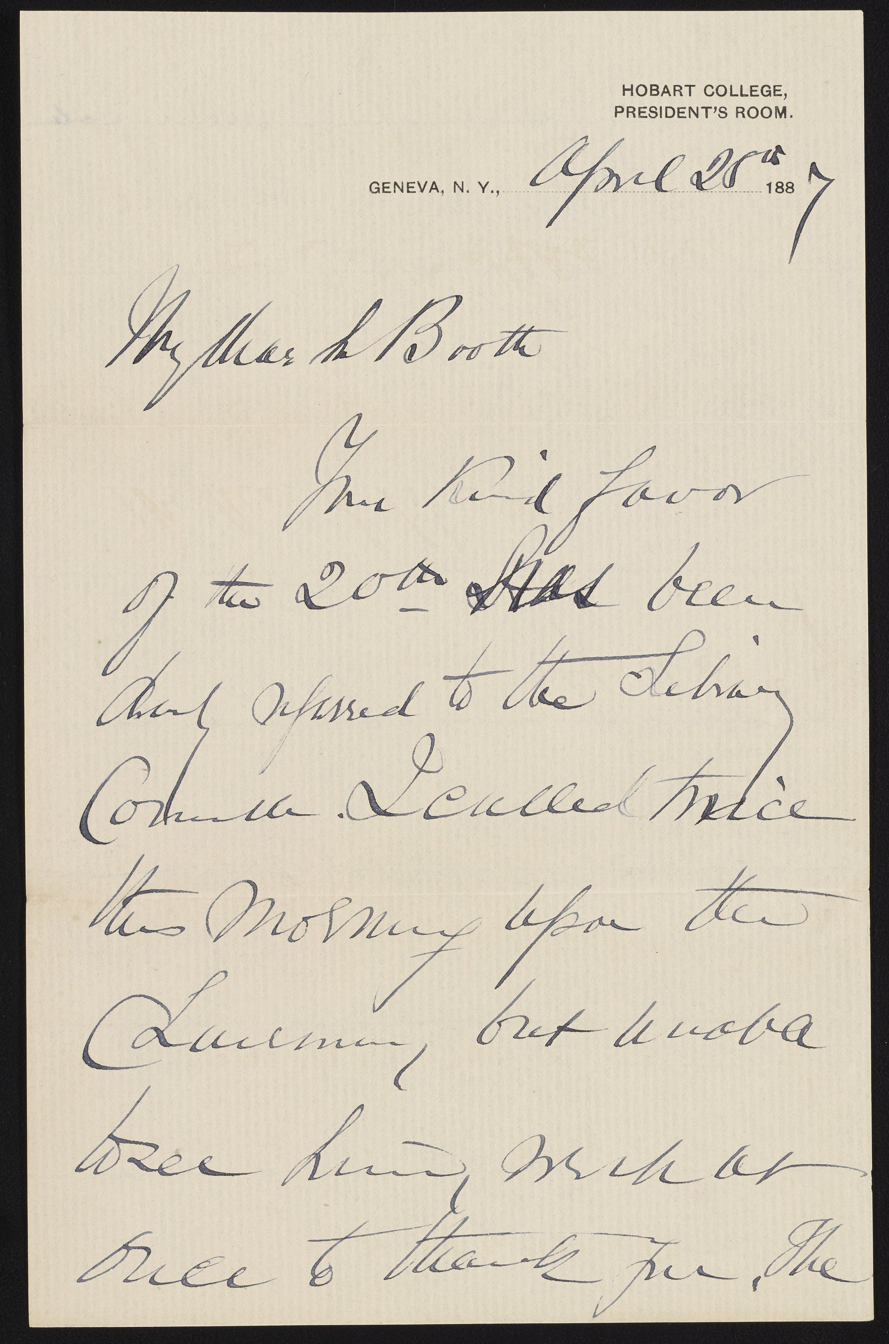 Small JPG1200 x 1813px — 310 KBLarge JPG2880 x 4351px — 1.8 MBFull-sized JPG3262 x 4928px — 2.2 MBOriginal fileTIFF — 3262 x 4928px — 46.0 MBC.M. Potter writes James Curtis Booth (1810-1888) a thank-you note for a donation made to the Hobart College Library.