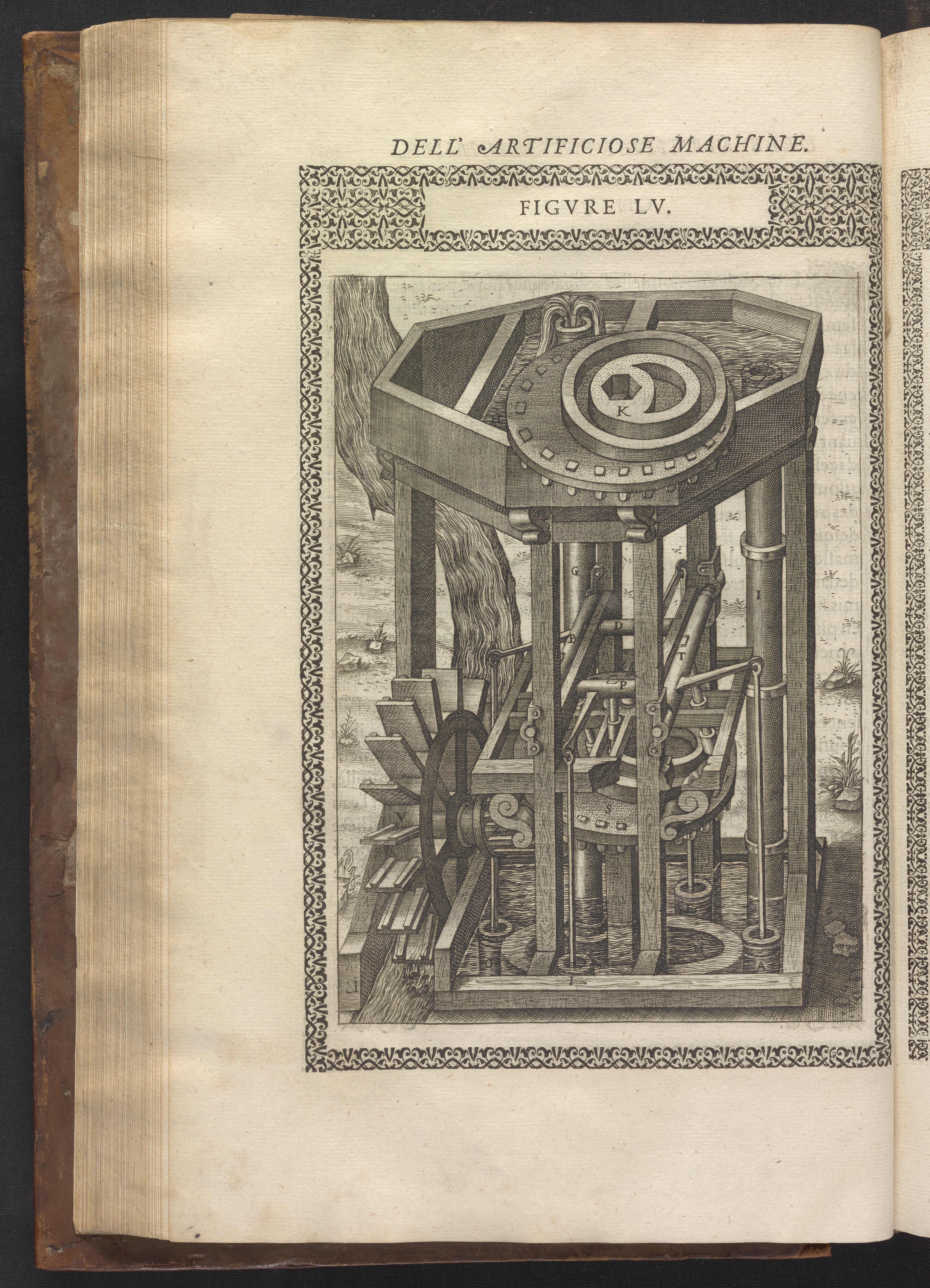 Ramelli, Agostino. “Plate 55: Device for Raising Water from a Pond by Canal Current.” In Le Diverse Et Artificiose Machine Del Capitano Agostino Ramelli. Paris, France, 1588. https://digital.sciencehistory.org/works/nk322d57c.