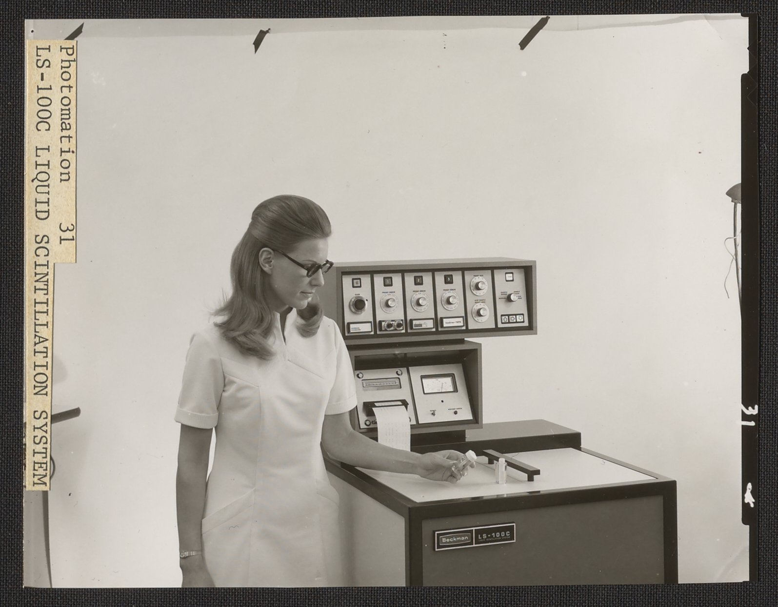 Woman using a Beckman LS-100C Liquid Scintillation System