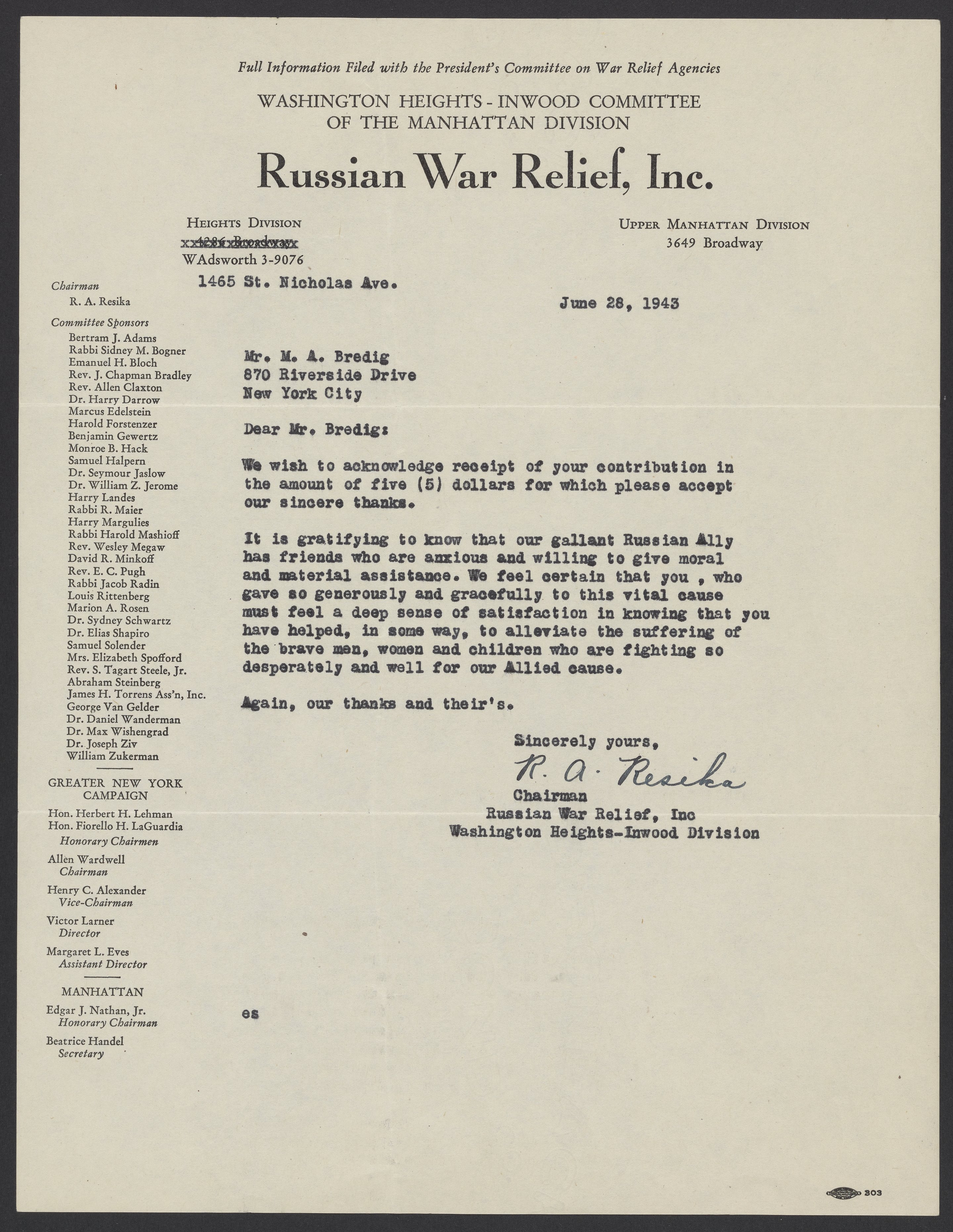 Letter from the Russian War Relief to Max Bredig, June 28, 1943