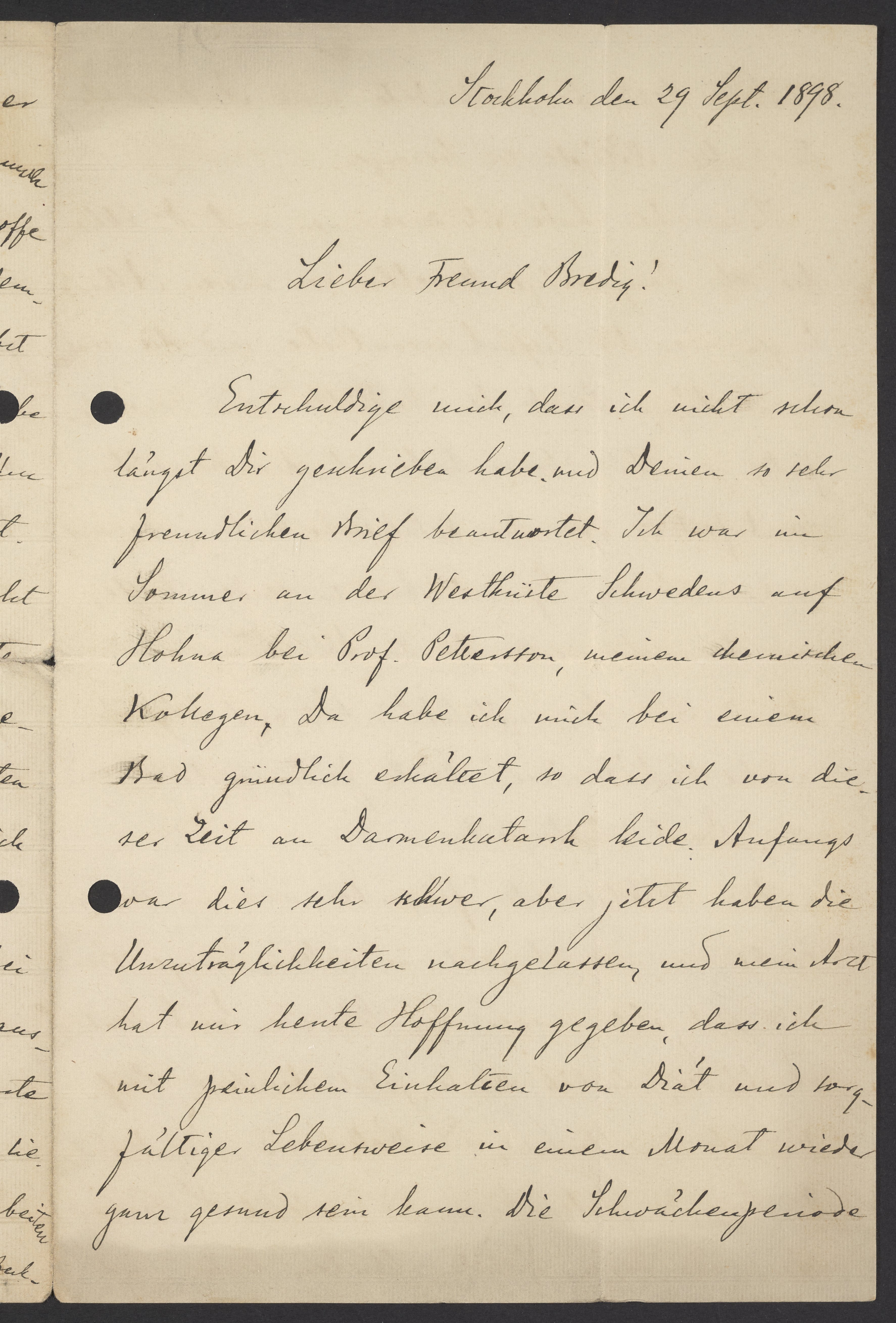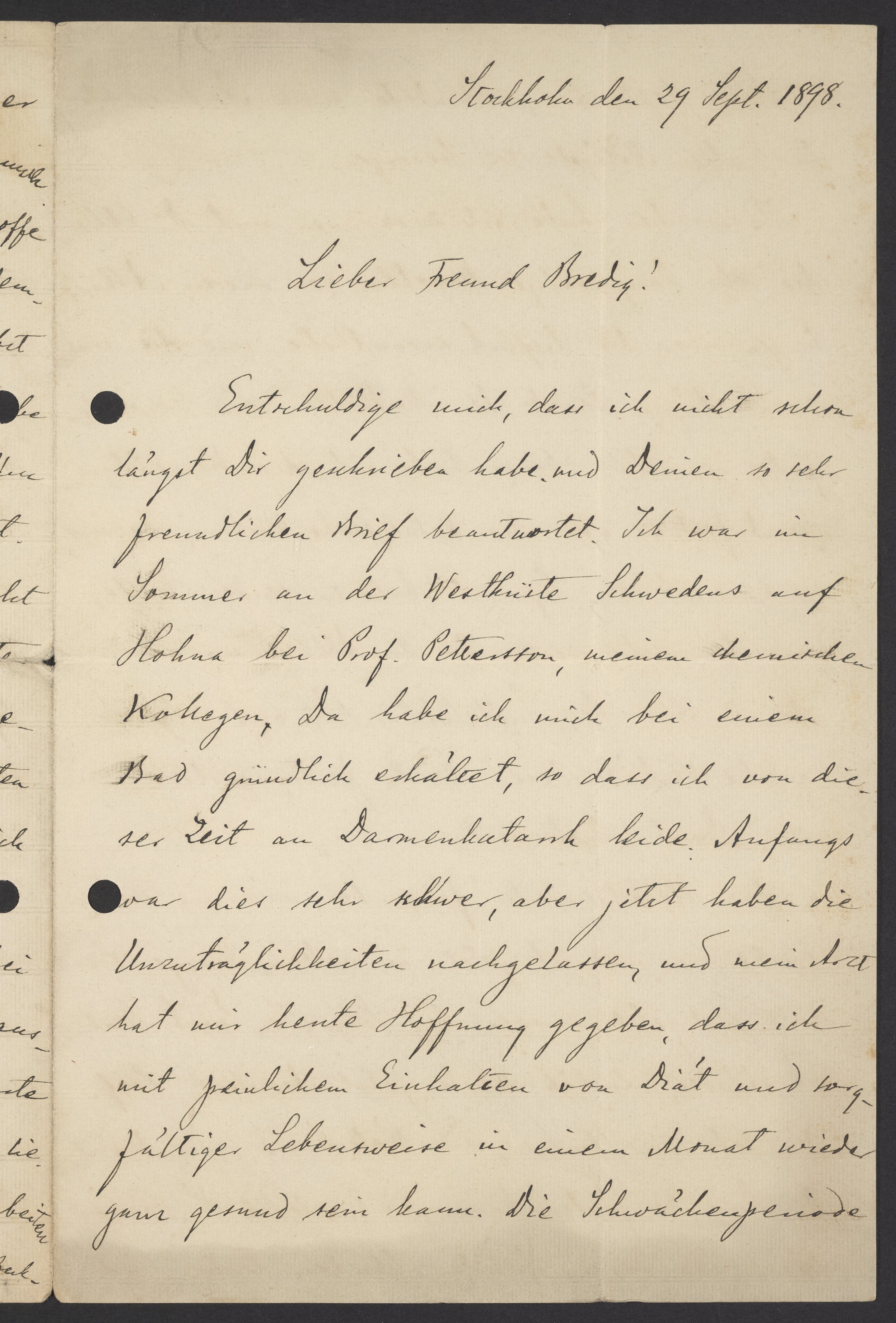 Entschuldige mich, dass ich nicht schon längst Dir geschrieben habe und Deinen so sehr freundlichen Brief beantwortet. Ich war im Sommer an der Westküste Schwedens auf Hohna bei Prof. Pettersson, meinem chemischen Kollegen. Da habe ich mich bei einem Bad gründlich erkältet, so dass ich von dieser Zeit an Darmenkatarrh leide. Anfangs war dies sehr schwer, aber jetzt haben die Unzuträglichkeiten nachgelassen, und mein Arzt hat mir heute Hoffnung gegeben, dass ich mit peinlichen Einhalten von Diät und sorgfältiger Lebensweise in einem Monat wieder ganz gesund sein kann. Die Schwächenperiode