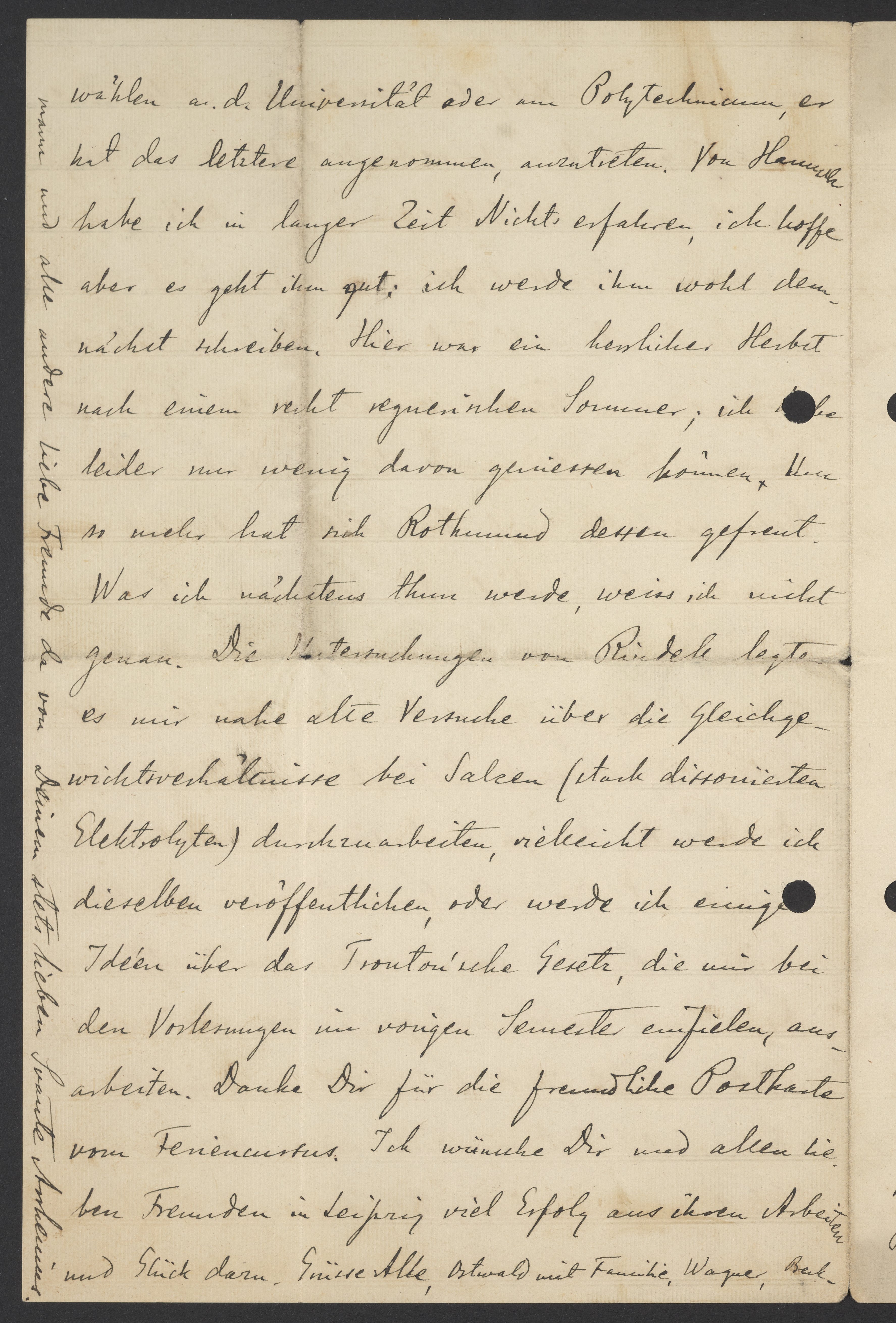 Was ich nächstens thun werde, weiss ich nicht genau. Die Untersuchungen von Rindell legte es mir nahe alte Versuche über die Gleichgewichtsverhältnisse bei Salzen (stark dissoziierten Elektrolyten) durchzuarbeiten, vielleicht werde ich einige Ideen über das Trouton’sche Gesetz, die mir bei den Vorlesungen im vorigen Semester einfielen, ausarbeiten. Danke Dir für die freundliche Postkarte von Feriencursus. Ich wünsche Dir und allen lieben Freunden in Leipzig viel Erfolg aus ihren Arbeiten und Glück darin. Grüsse Alle, Ostwald mit Familie, Wagner
