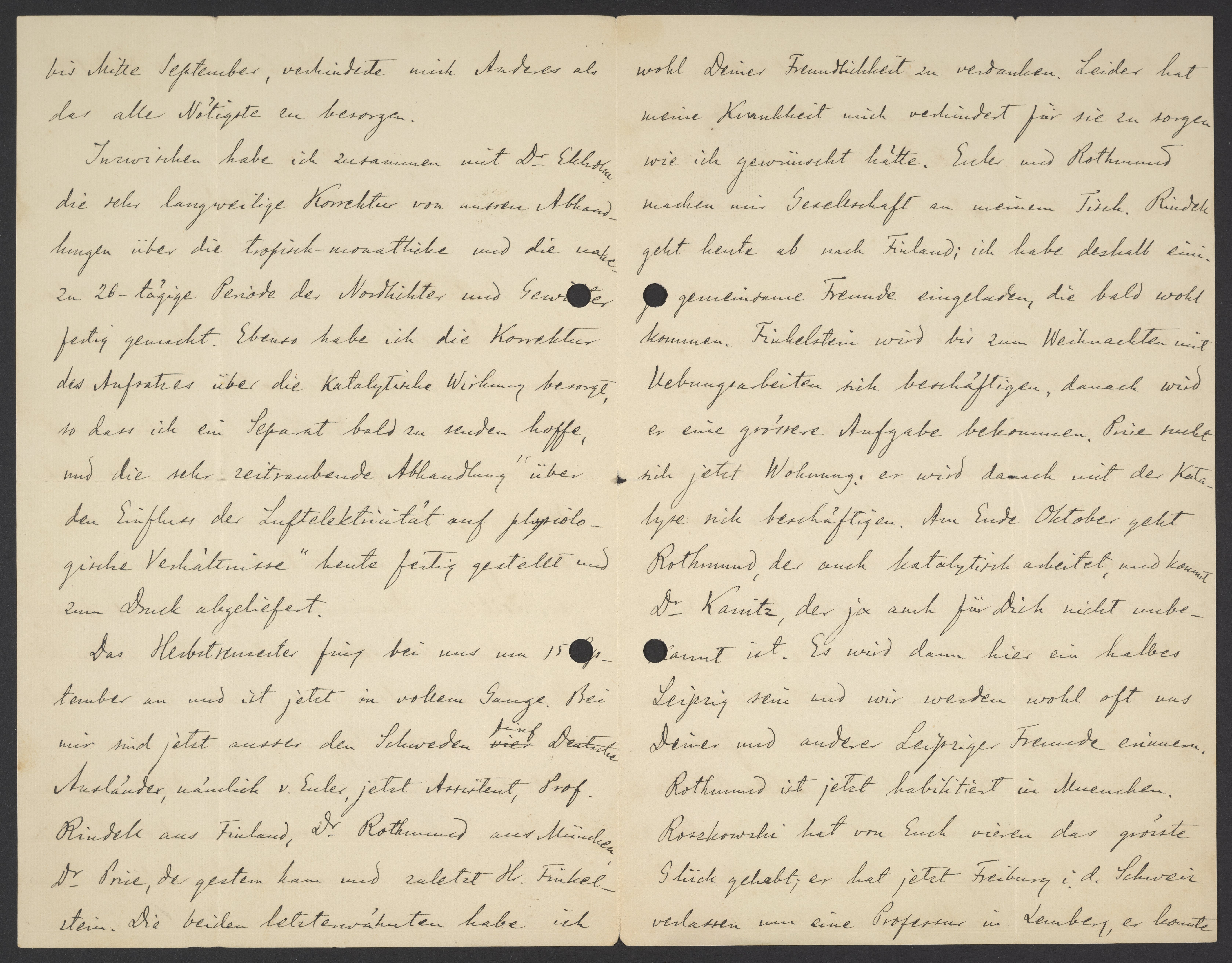 I credit the arrival of the latter two scientists to your generosity. Unfortunately, my illness prevented me from taking care of them as I would have liked. Euler and Rothmund keep me company at my dinner table. Rindell is leaving for Finland today. I have therefore invited over some mutual friends, who will probably arrive soon. Finkelstein will be occupied with practice experiments until Christmas, after which he will be given a more substantial assignment. Price is now looking for an apartment and will then work on catalysis. At the end of October, Rothmund, who also works on catalysis, will leave. Dr. Kamitz, who you know, will replace him. It will be like a reunion of our group in Leipzig. We will think of you and our other friends.