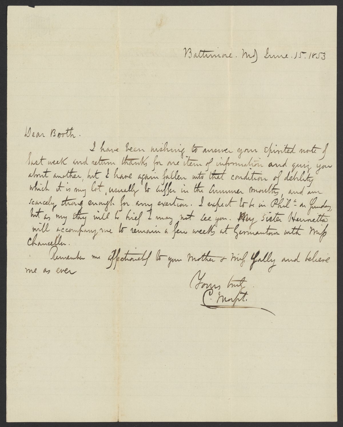 Small JPG1200 x 1494px — 206 KBLarge JPG2880 x 3587px — 960 KBFull-sized JPG3285 x 4091px — 1.2 MBOriginal fileTIFF — 3285 x 4091px — 38.5 MBCampbell Morfit (1820-1897), a distinguished chemist and co-editor with James Curtis Booth (1810-1888) of the Encyclopedia of Chemistry (1850), writes Booth that he expects to visit Philadelphia.