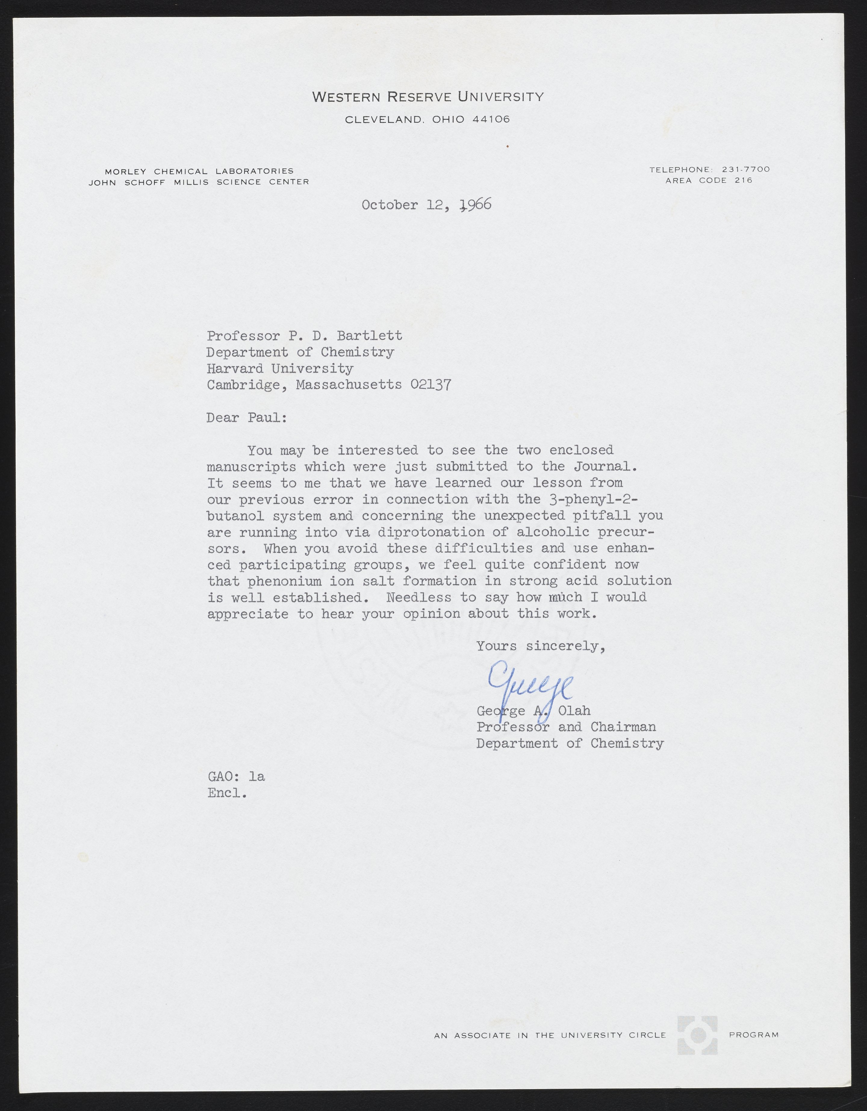Letter from George Olah to Paul Bartlett
