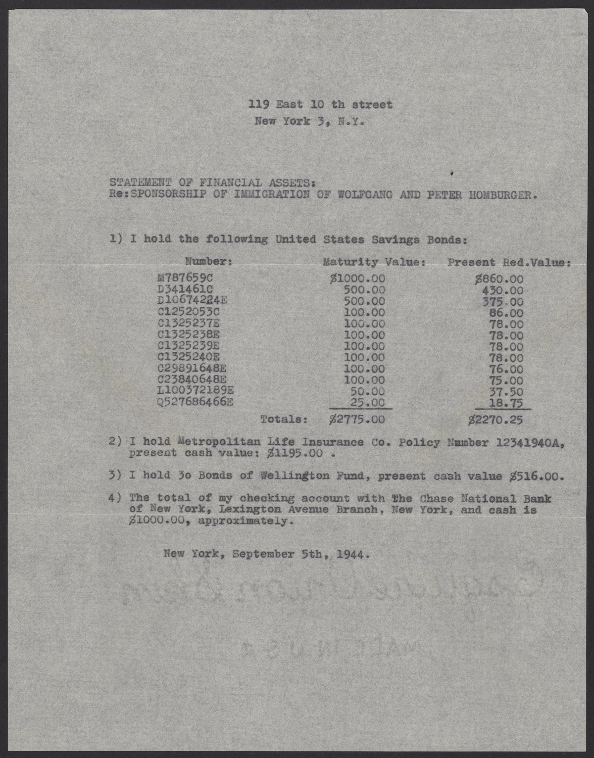 Max Albert Bredig's (1902-1977) statement of financial assets, for the sponsorship of his nephews Wolfgang and Peter Homburger.