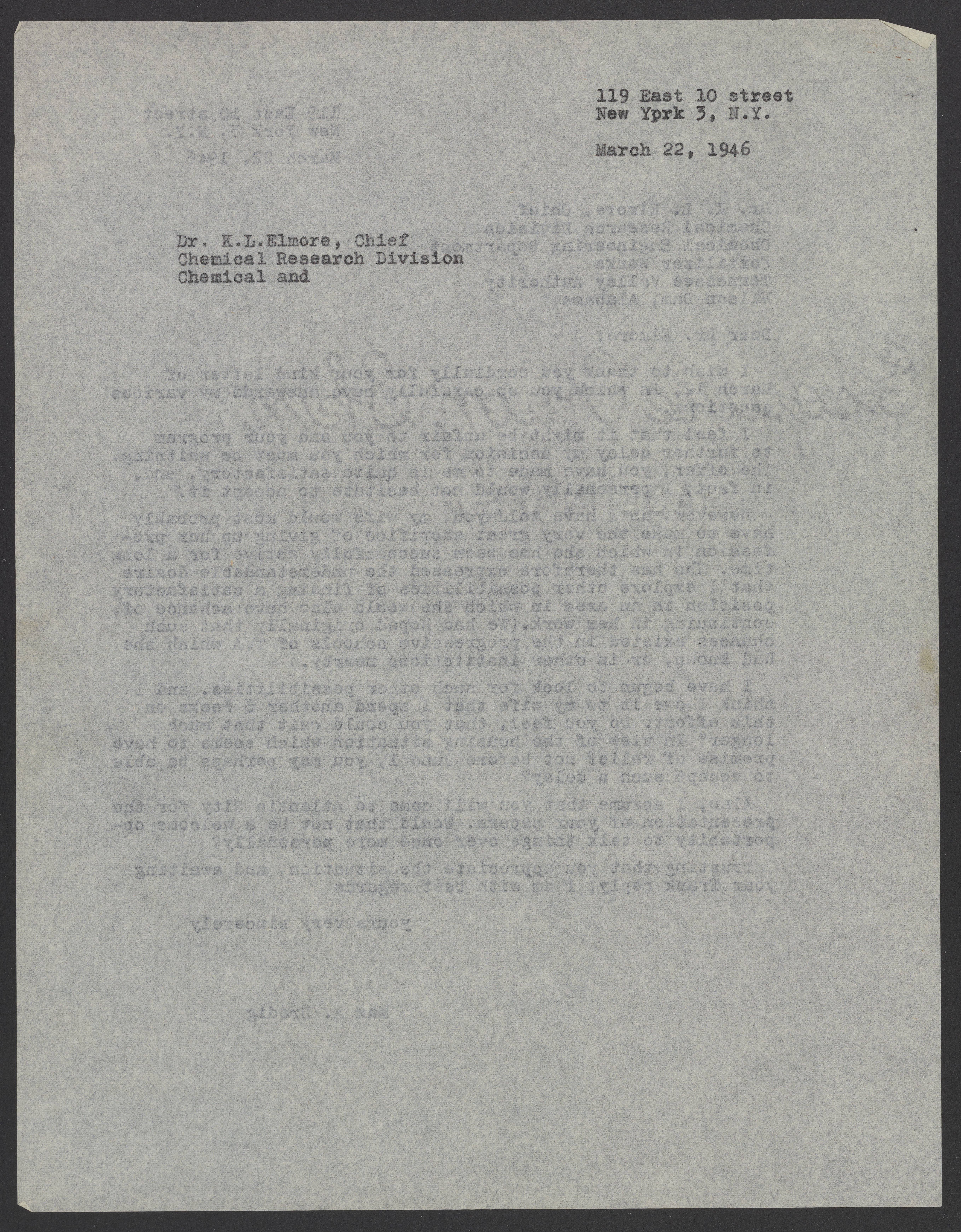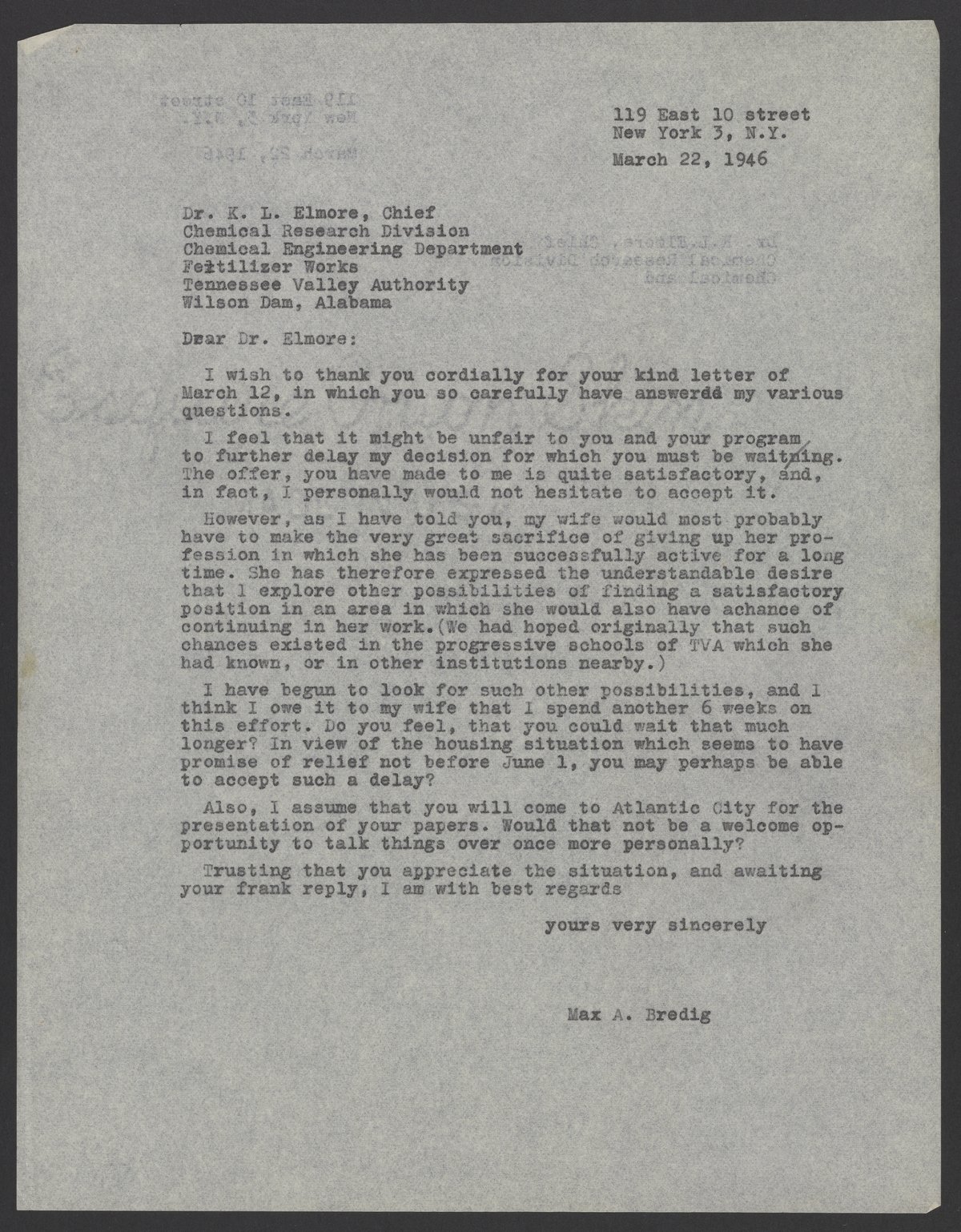 Bredig, Max Albert. “Letter from Max Bredig to Kelly L. Elmore, March 22, 1946,” March 22, 1946. Papers of Georg and Max Bredig, Box 10, Folder 34. Science History Institute. Philadelphia. https://digital.sciencehistory.org/works/nq0w8ar.